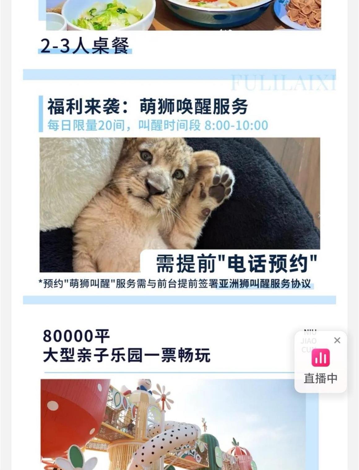 宿迁酒店上演“猛宠叫醒”:小狮子走进房间,一晚628元火爆预约 你见过用小狮子当“叫醒服务”吗?最近,江苏宿迁一处田园度假区火了:只需要花628元订一晚指定房型,不仅能在酒店住得舒舒服服,早上8-10点,还有憨态可掬的小狮子来到房间当“闹钟”,陪伴互动7分钟,专属饲养员全程守护。据说服务每天限量20间,想体验的话要提前预约,现在已经约满到11月24日,预定页面都快挤爆了。 据工作人员介绍,这只“萌狮唤醒”是该度假区的网红服务之一,园区自带动物展示区,并宣称拥有相关饲养资质。家长带娃来玩趣味性直接拉满,还能免费畅玩亲子乐园、包含餐饮任选。当然,幼狮毕竟是野生动物,签署“亚洲狮叫醒协议”,互动期间家长看护、饲养员陪同都是刚需,安全第一不能忽视。 酒店方的创意获得了不少网友点赞,有人吐槽“小狮子比真人闹钟还靠谱”,也有人关心动物福利和合规问题。目前当地农业农村局尚未公开回应,但景区表示如果没能约上叫醒服务,还可以体验动物见面会。至于真正的“萌宠经济”未来怎么发展,大家怎么看?