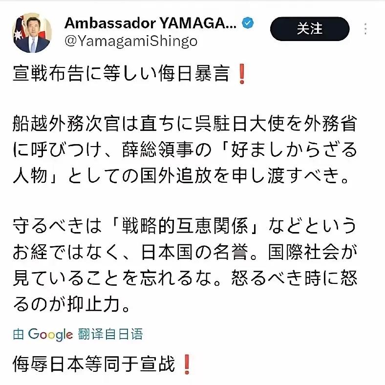11月10日,日本驻澳大利亚大使山上信吾发文:“侮辱日本等同于宣战!” 网友表示:借用《南京照相馆》的一句台词,我们不是朋友,永远不是!! 哪儿来的底气,他非要挑战。如果像俄罗斯那样对待俘虏,现在估计声都不敢出。孔子的想法不应该存在。 太玻璃心了,就这都受不了?侵华战争十几年,这个账我们可记着呢[灵光一闪] 太玻璃心了,就这都受不了?侵华战争十几年,这个账我们可记着呢[灵光一闪] 大家怎么看?