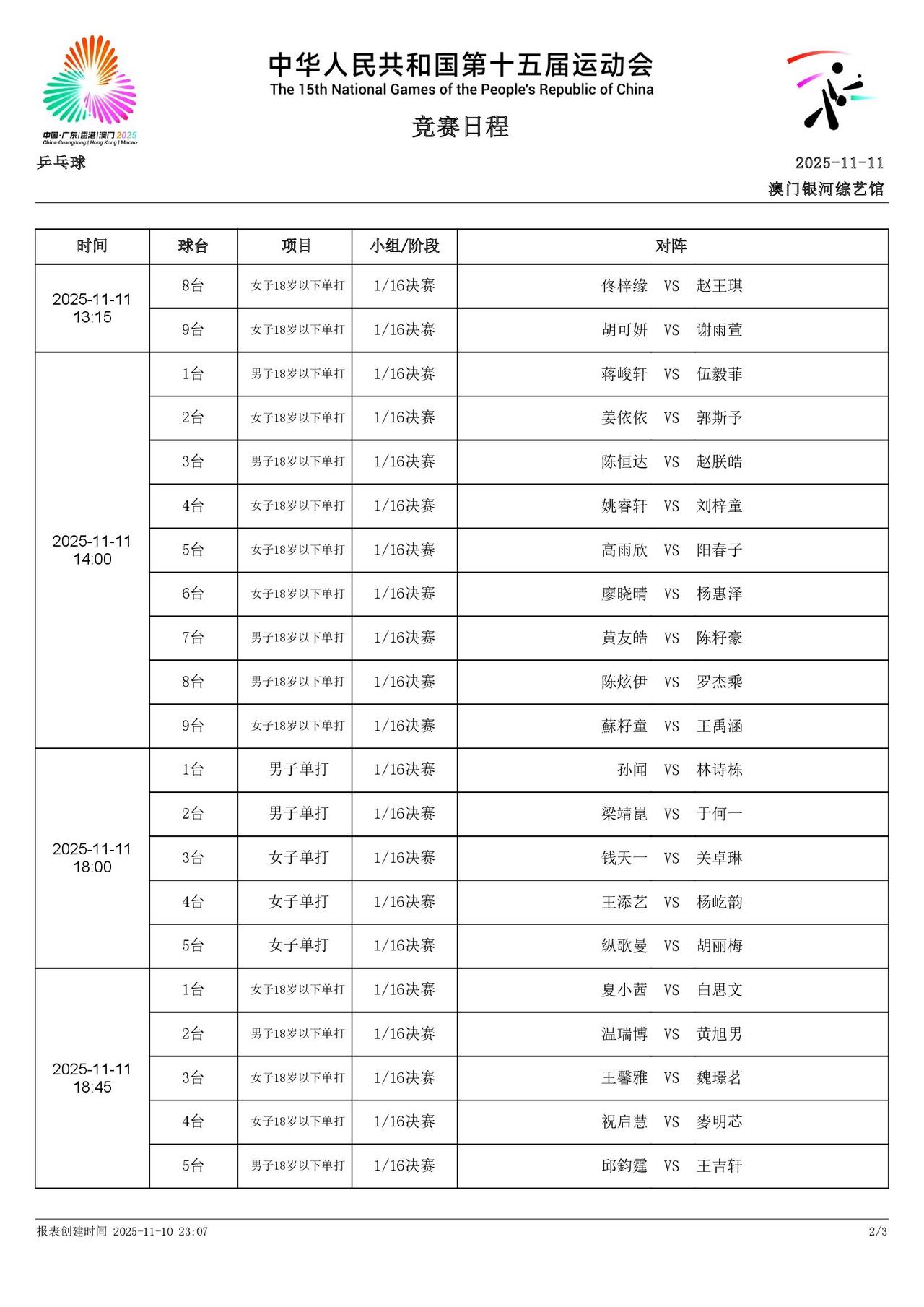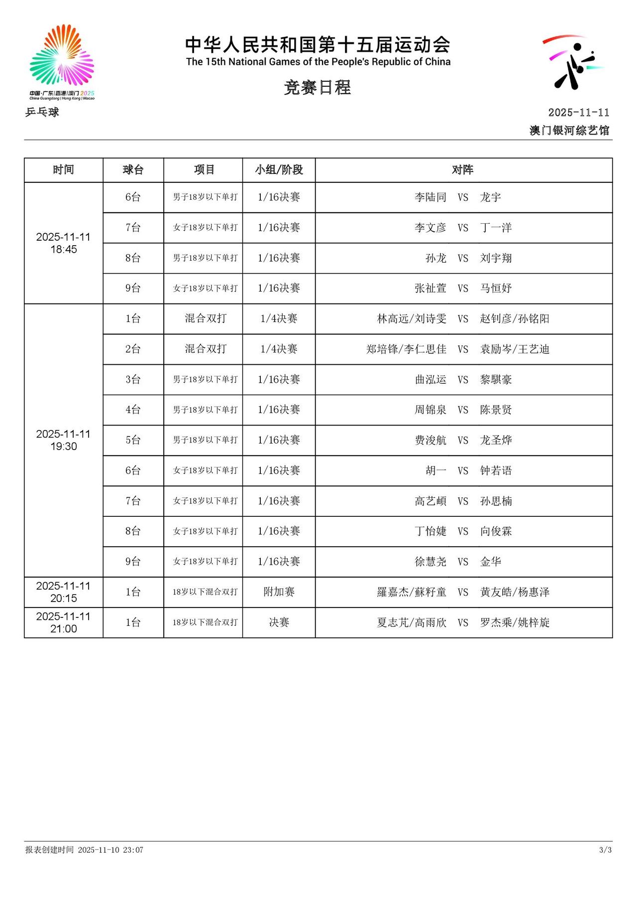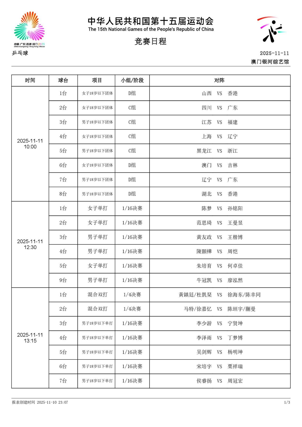 全运会11月11日赛程表,王曼昱林诗栋梁靖崑陈梦等首战开始。 今天成人组即将要开始的是,单打1/16决赛, 混双1/4决赛。 单打也是今天这些参赛选手的首场比赛。 其中中午12:30开始的是王曼昱,何卓佳,牛冠凯,陈梦等的比赛, 下午6点是林诗栋,梁靖崑他们的比赛, 今天比赛结束,首轮比赛就全部结束了。 截止目前向鹏,陈垣宇,徐瑛彬被淘汰,这是赛前被重点看好的队员, 所以比赛没有应该之说。 这八组混双的比赛,还是很期待的, 实力都挺强。 期待今天的精彩赛事。