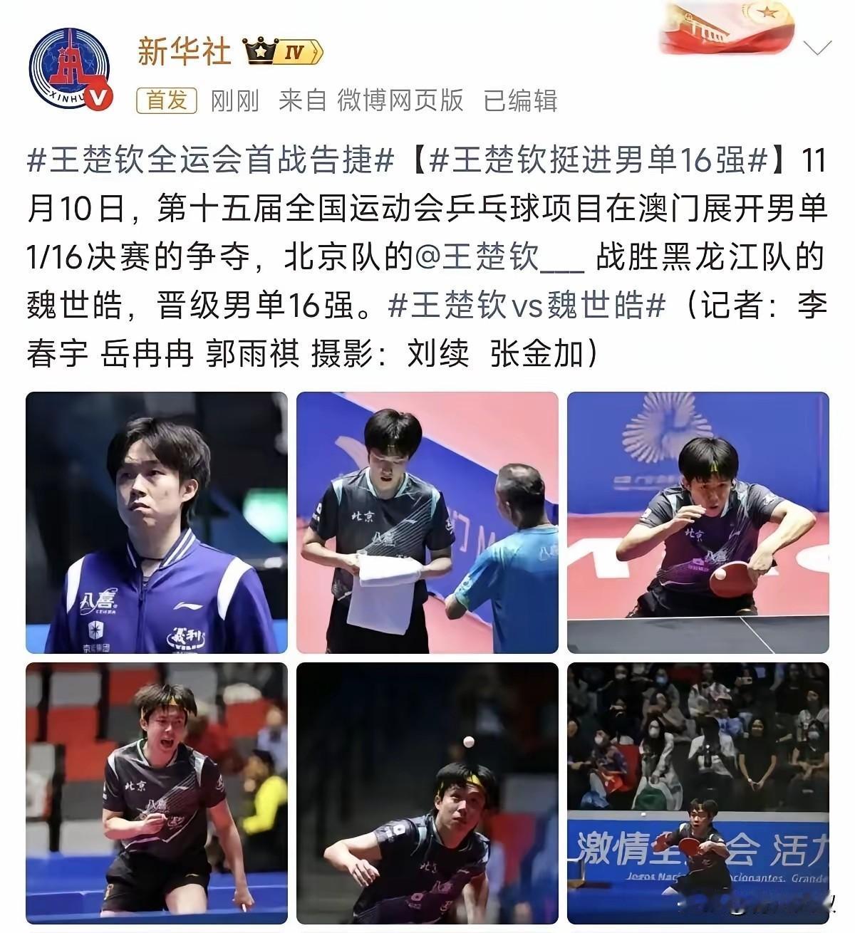 由于王楚钦在二号台,我们拿不到高清图,新华社记者帮我们拍了, 还出了报道! 大头和魏世皓的比赛, 充分展示了国乒的底蕴, 我们不太熟的魏世皓, 和大头有过两次交手, 一赢一输。 昨天大头打的也不轻松, 五局有四局比分达到11:8 我现场观看比赛的时候, 真为大头捏了一把汗, 同时我又是高兴的, 中国乒乓球底蕴太厚重了。