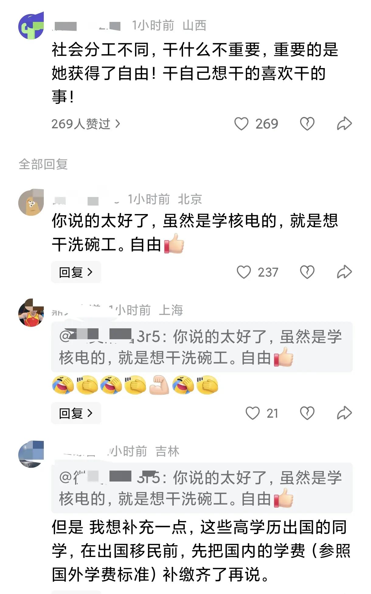 核电工程师2000年技术移民加拿大,现在是洗碗工,网友神评:重要的是她获得了自由[微笑] 她应该没和亲朋好友、原同事联系过,落差太大了[捂脸]