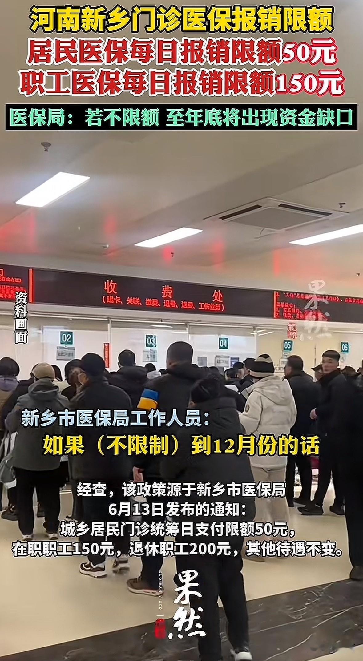 河南新乡6月起执行门诊医保日限额,居民报50元、在职职工150元、退休职工200元,7月还下调了部分慢性病月限额,引发不少人吐槽。 官方回应是为了防欺诈骗保,说普通门诊费用大多一两百,限额够多数人用,超了就自费。但慢性病患者觉得不够,一次购药可能超限额,又不能分多次报,负担变重。 其实防骗保是好事,毕竟医保基金是大家的“保命钱”,但“一刀切”的限额是不是能更灵活点?比如给慢性病、特殊病种单独设更高限额,既护好基金,也不让特殊人群受影响,这样是不是更稳妥?