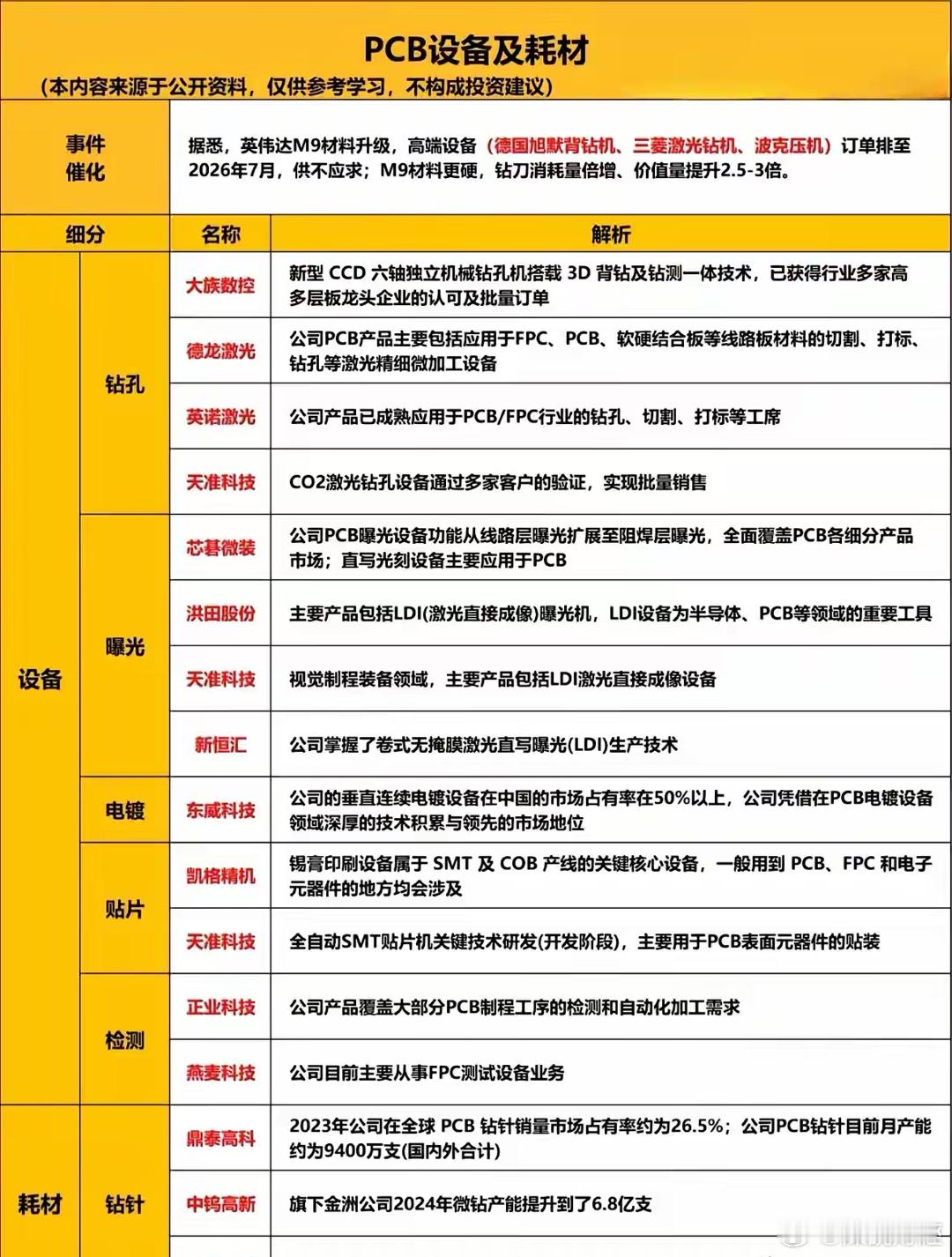 随着高端电子材料升级,PCB产业链迎来新一轮技术迭代。据悉,新一代材料硬度显著提升,对钻孔设备精度与耐用性提出更高要求,高端钻机等核心设备订单已排至2026年,市场呈现供不应求态势。与此同时,钻头等关键耗材因磨损加剧,消耗量成倍增长,价值量也显著提升。