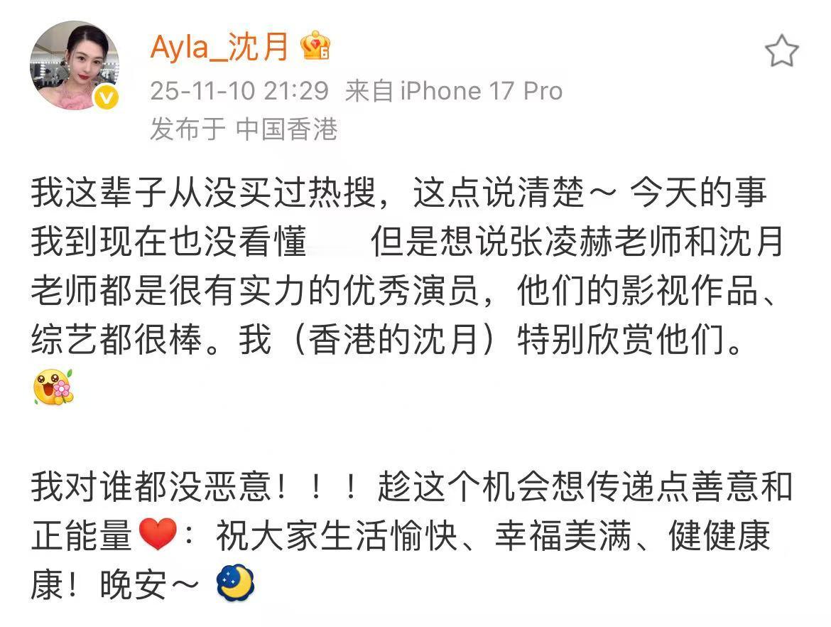 我对谁都没恶意!!!趁这个机会想传递点善意和正能量[心]:祝大家生活愉快、幸福美满、健健康康!晚安~ [月亮]”但不是这个沈月