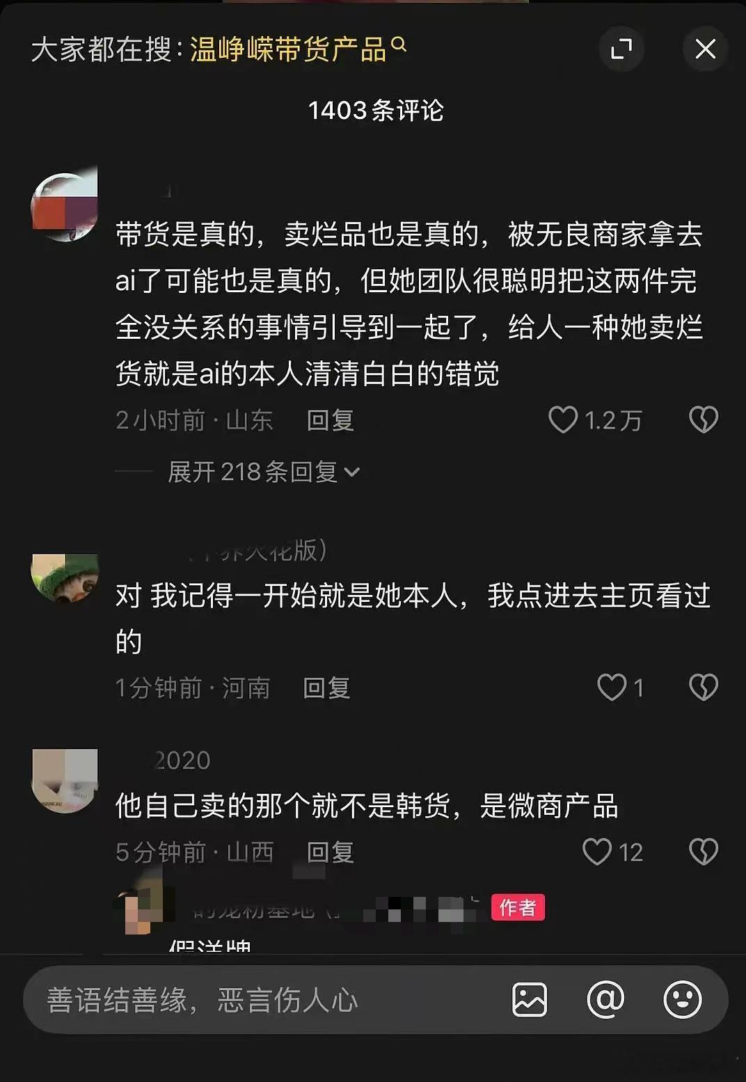 你们吃温峥嵘这个瓜了吗?简单来说就是温峥嵘带了不好的货,然后刚好有人ai换脸她卖货,她那边就打假澄清,模糊成温峥嵘没带过货。