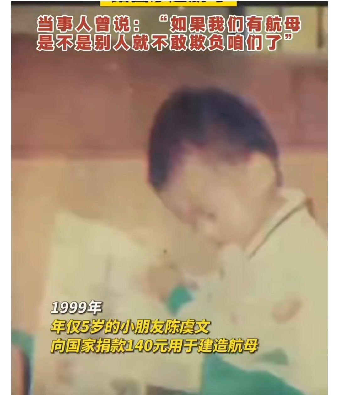 当年5岁的陈虞文,因目睹北约轰炸南联盟深受触动,心生“有航母就没人敢欺负咱们”的想法,分4次捐出140元支持航母建造,相关部门曾回信退款并予以表扬。