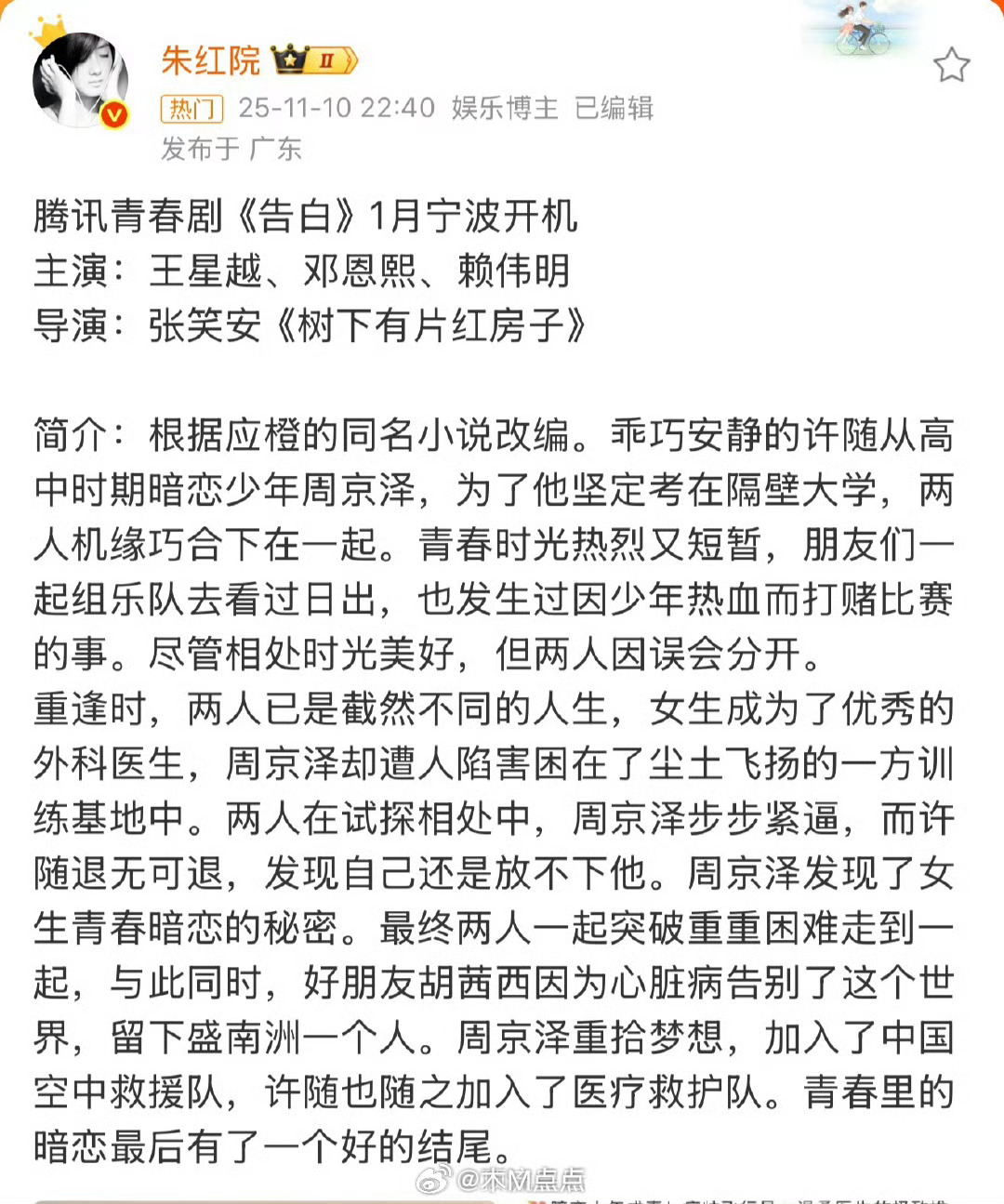 于正回应王星越出演《告白》:“刚收到剧本,没看完,没评估,别整得跟什么似的。” 我觉得王星越和现偶的适配度很高诶,身高有,气场有,演技有。 告白 王星越