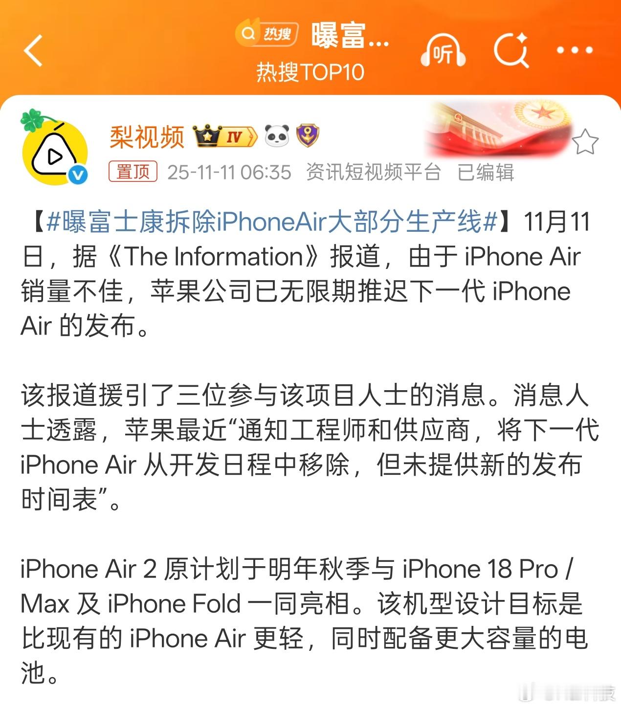 早就注定的事,做那么薄,无论如何续航、影像这两部分是被牺牲掉的,加上还是esim写卡,价格昂贵,能好卖才怪。苹果尝试了SE机型、mini机型、Plus机型、Air机型,基本都宣布失败[允悲]曝富士康拆除iPhoneAir大部分生产线