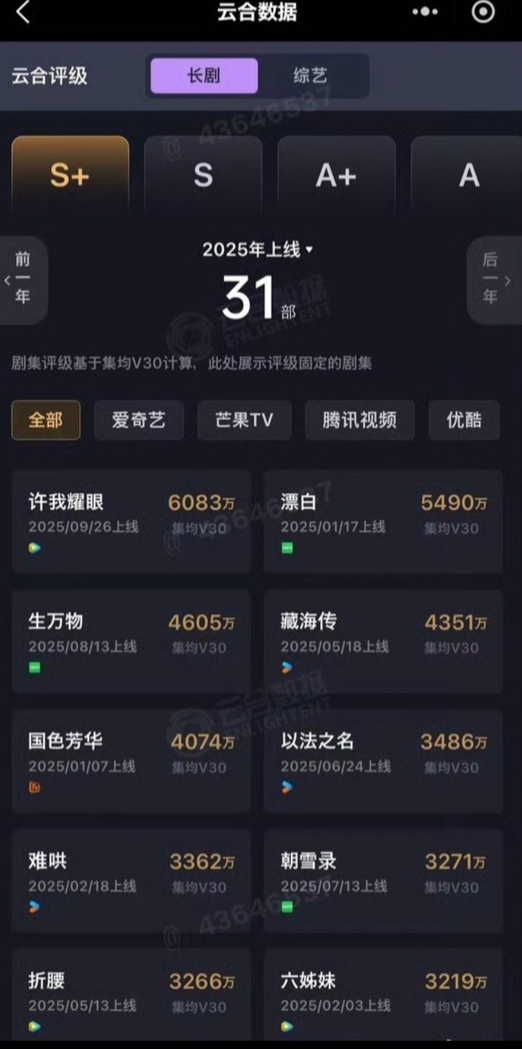 许我耀眼云合热播期集均播放量6328万,V30集均播放量6083万,不出意外能锁定全平台年冠了