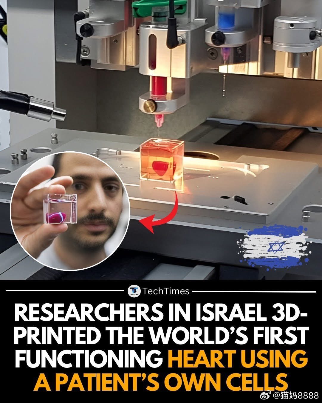 以色列科学家史无前例地成功利用患者自身的细胞和生物材料,3D打印出一颗活体跳动的心脏。这颗心脏包含血管、心腔和组织,由特拉维夫大学采用一种将脂肪细胞重编程为能够形成心肌组织的干细胞的技术打印而成。