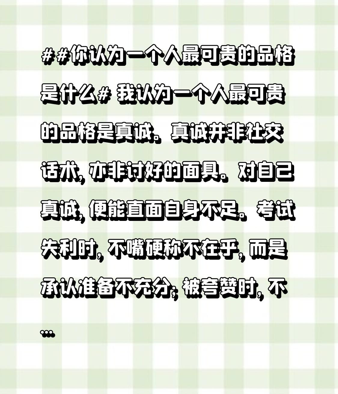 我认为一个人最可贵的品格是真诚。真诚并非社交话术,亦非讨好的面具。 对自己真诚,便能直面自身不足。考试失利时,不嘴硬称不在乎,而是承认准备不充分;被夸赞时,不故作谦虚,大方接受并表达开心。这种诚实能让人认清自己,接纳自身优缺点,使内心更强大,还能将精力用于自我成长。 对他人真诚,不欺瞒。朋友衣服不合适,不违心夸赞,温和指出不足;同事方案有漏洞,坦诚相告。真诚待人,能收获真心,让人际关系更纯粹。 在工作中保持真诚,能让我们坚守职业操守。不投机取巧,不虚假邀功,凭借自己的真才实学和辛勤付出赢得认可。遇到难题时,不推诿责任,真诚地承担起自己的那一份,积极寻找解决办法。这样不仅能提升自己的能力,还能树立良好的职业形象,为自己的职场发展打下坚实基础。 在爱情里保持真诚,意味着毫无保留地展现真实的自己。不伪装、不做作,让对方看到自己的喜怒哀乐、优点与缺点。当出现矛盾时,真诚地沟通,表达内心的想法和感受,而不是冷战或隐瞒。如此,爱情才能在坦诚的土壤中茁壮成长,历久弥坚。 真诚,是人生道路上的一块基石,它支撑着我们在各个方面稳步前行,让我们成为更好的自己,收获更美好的生活。