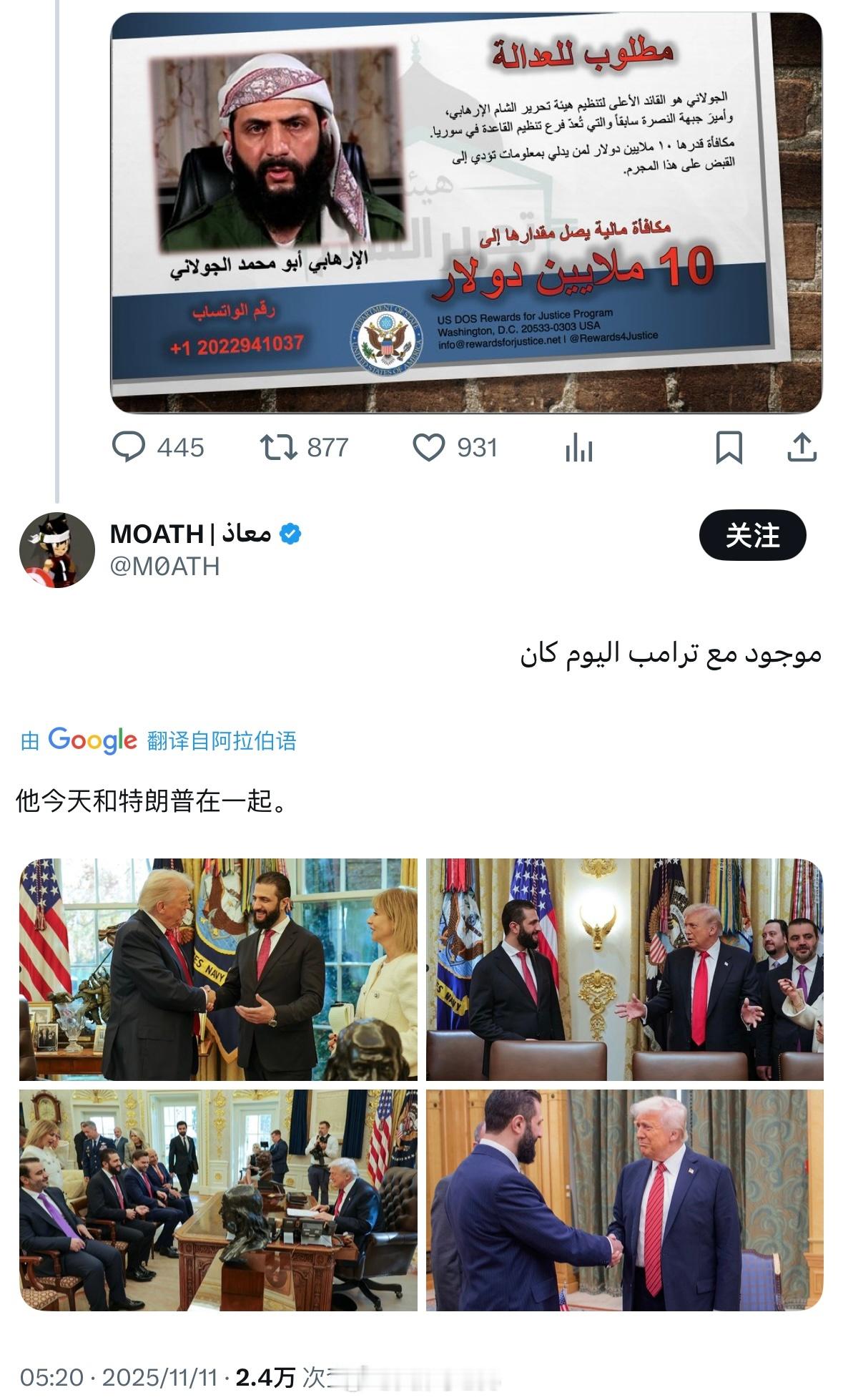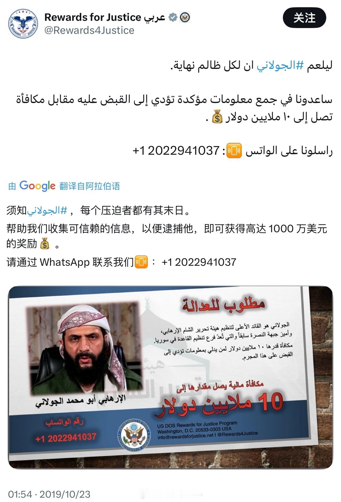 在特朗普会见朱拉尼后,美国国务院“正义奖赏计划”账号被挖坟了