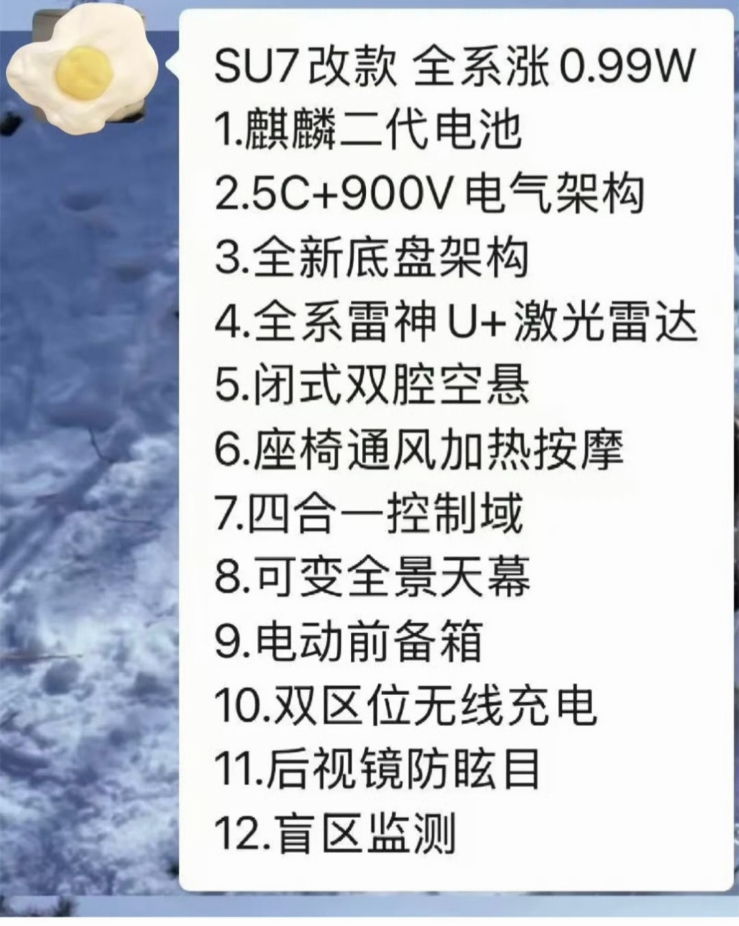 小米SU7改款涨价近1万网传小米SU7改款配置,我觉得还行,其实吸引力不算大,除了三电升级,主要解决的就是之前吐槽的点吧[doge]