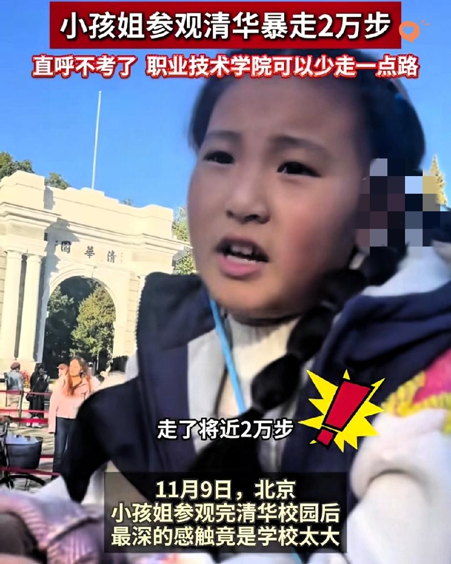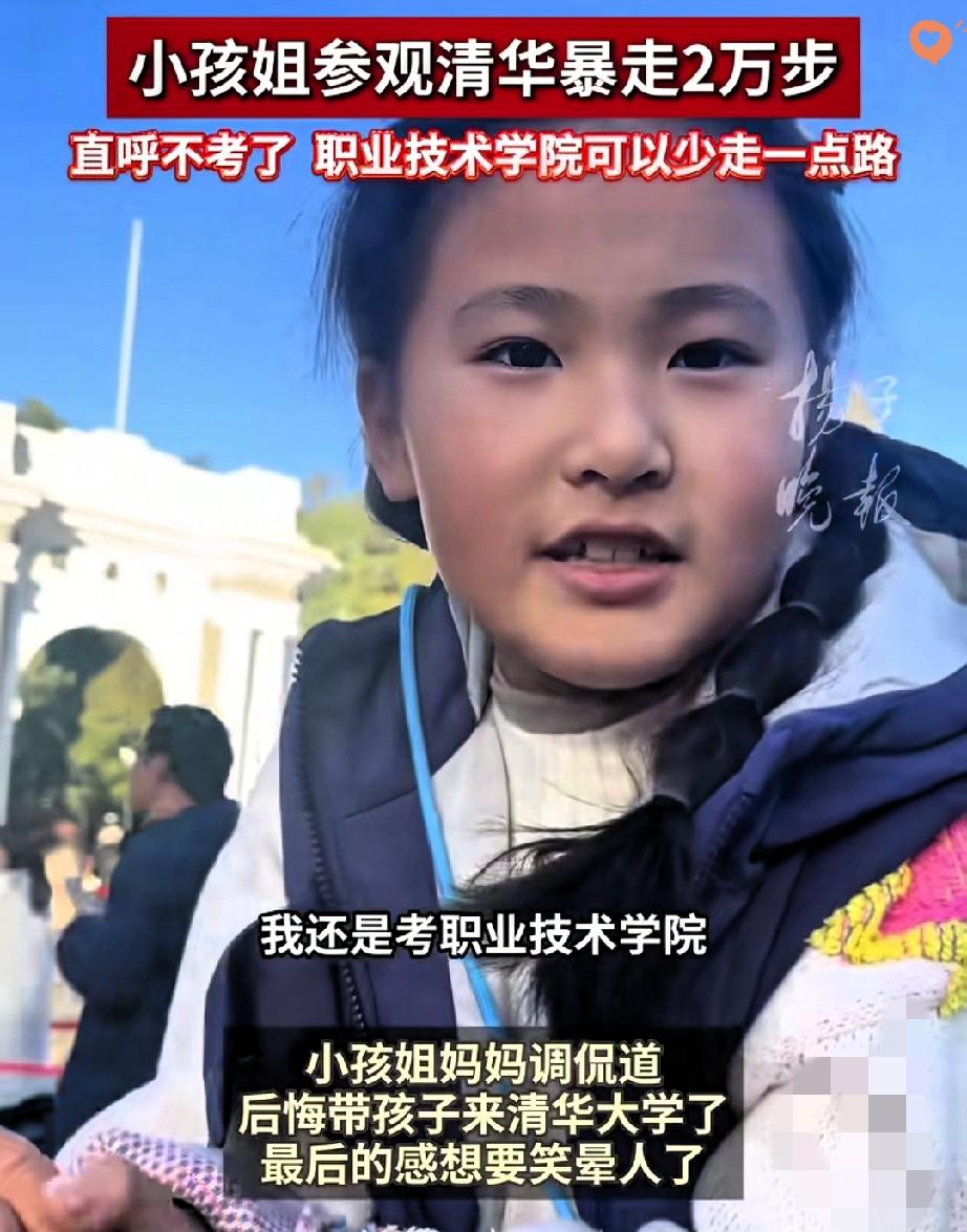 北京清华校园打卡,妈妈本想给女儿种“名校梦”,结果逛完女儿一句话让她哭笑不得:“学校太大走了两万步,我还是考职校吧,能少走路!” 这理由真的太戳笑点了! 小时候的想法就是这么纯粹,根本不懂名校背后的含金量,只盯着眼前的“走路累”。 妈妈的初衷特别好,但孩子的世界里,舒服可比“未来目标”实在多了。 其实不用后悔带娃去,童年的小吐槽说不定会变成未来的小动力。 等她长大懂了清华的意义,再想起当年因为怕走路放弃的“小幼稚”,说不定会更努力呢? 你家娃有没有说过这种让人哭笑不得的“摆烂发言”? 或者你觉得这娃长大后会改变想法吗?来评论区聊聊~