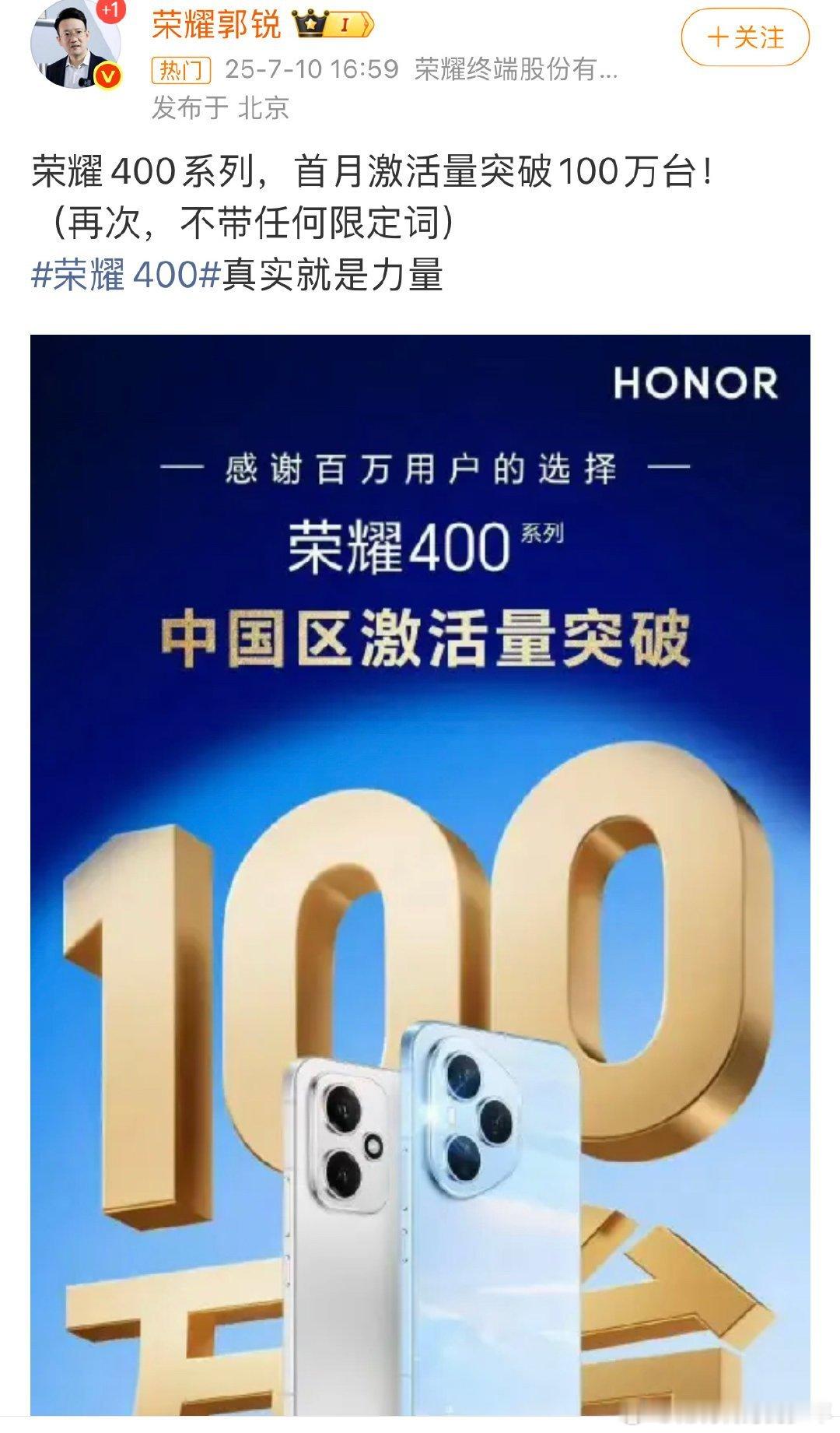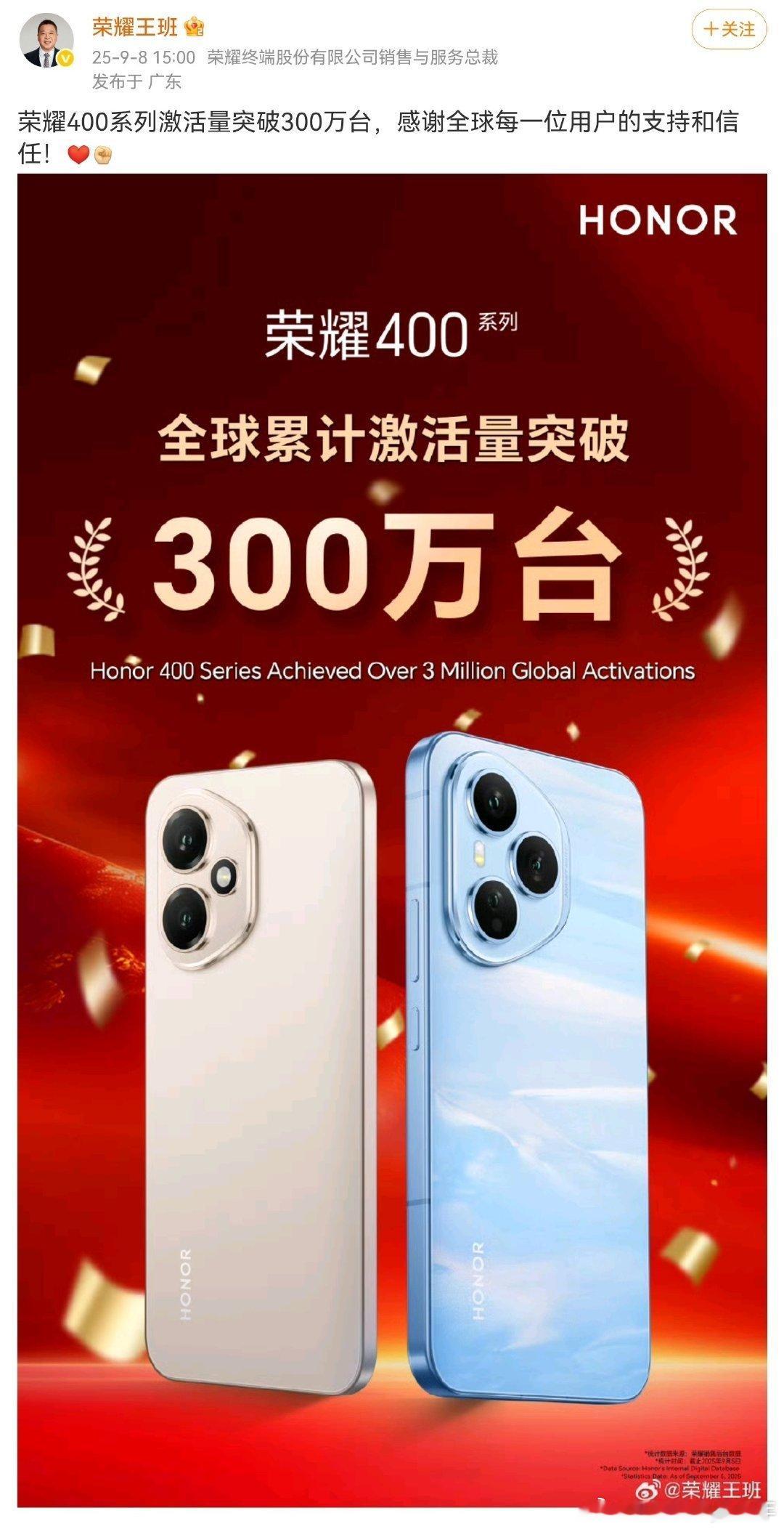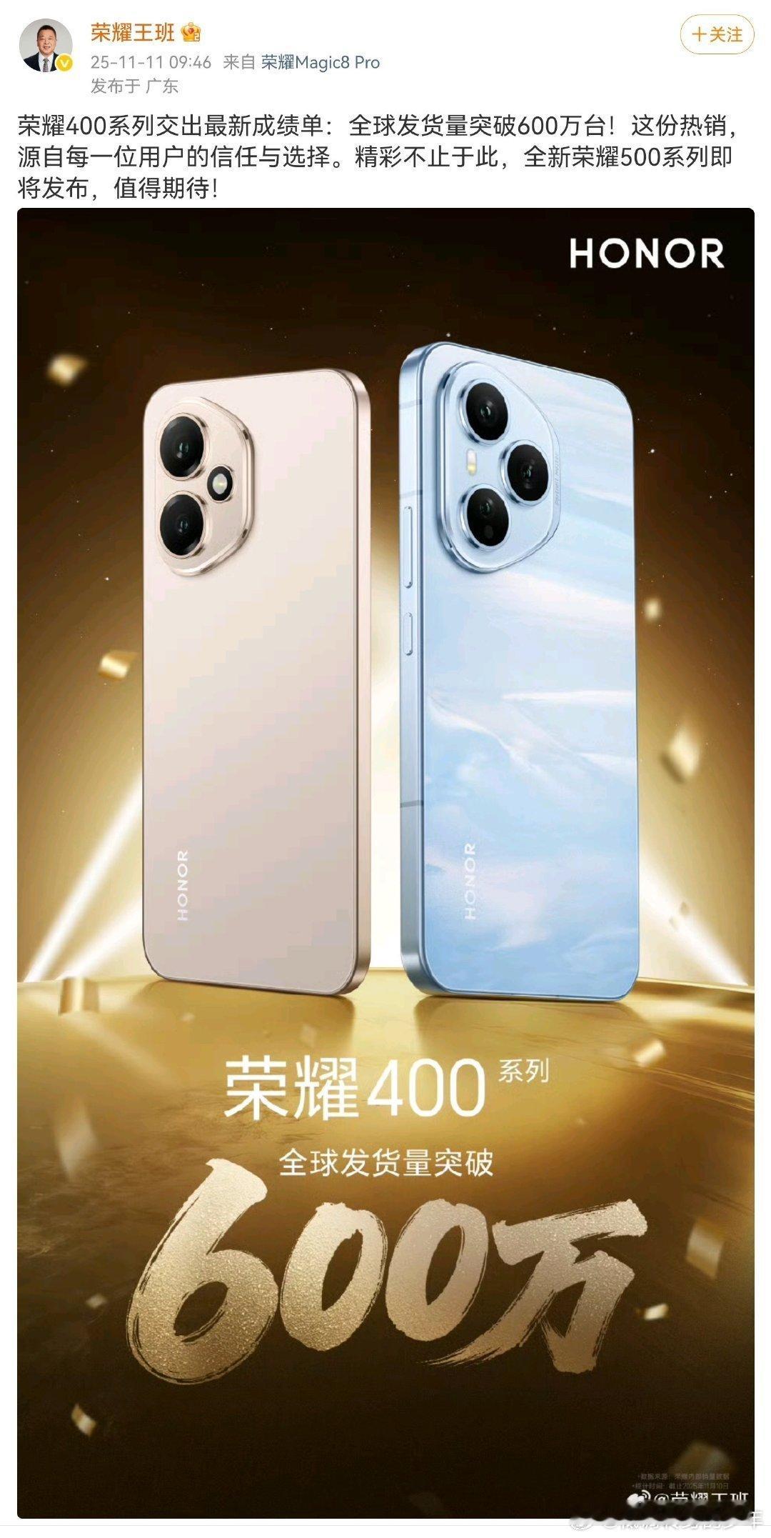 肖战代言的荣耀400系列全球发货量: