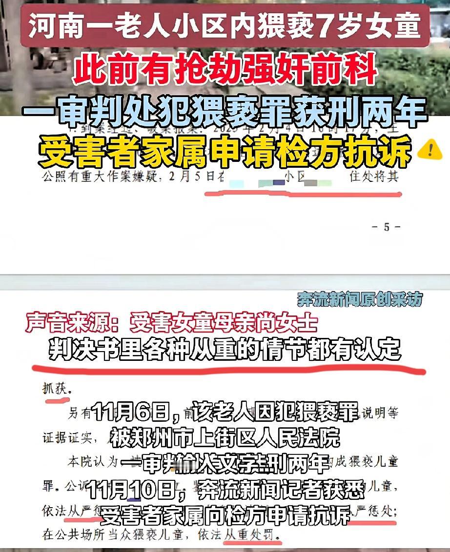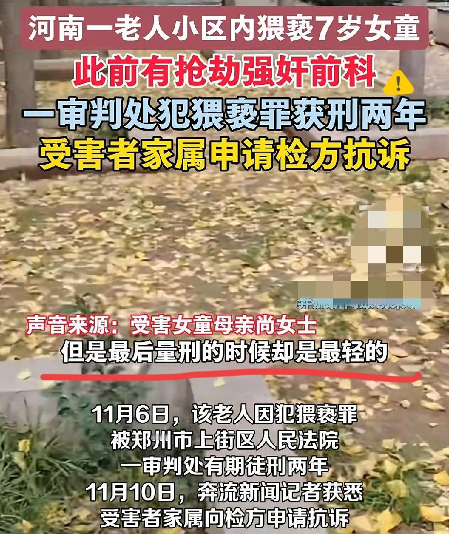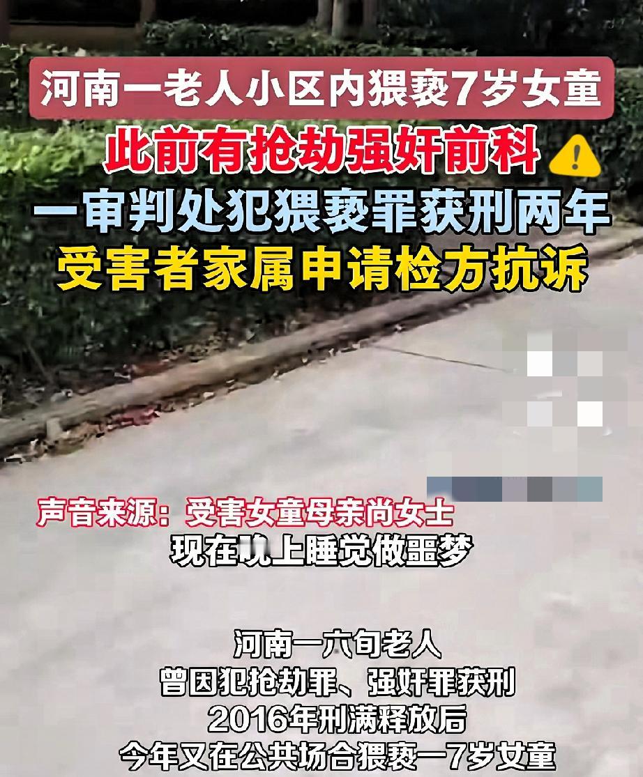 60岁惯犯当众猥亵7岁女童,只判两年?这判决真的能服众吗! 河南郑州小区里,老人光天化日哄骗幼女、伸手进衣服作案,想想都让家长脊背发凉。 更气人的是,这老人有抢劫、强奸前科,主观恶性明明极大,却因过了累犯期限,最终只获刑两年。 家属索赔35万被拒,理由是只认物质损失,可孩子的心理创伤是一辈子的啊! 法律不能只抠条文,更要护着孩子的安全感。 对伸向未成年人的恶行,轻判不仅安抚不了受害者,更难形成震慑。 法律的底线该是让坏人付出代价、让弱者有依靠,这样的判决真的合理吗? 你觉得该如何平衡法律条文与民心所向?来评论区说说你的看法~