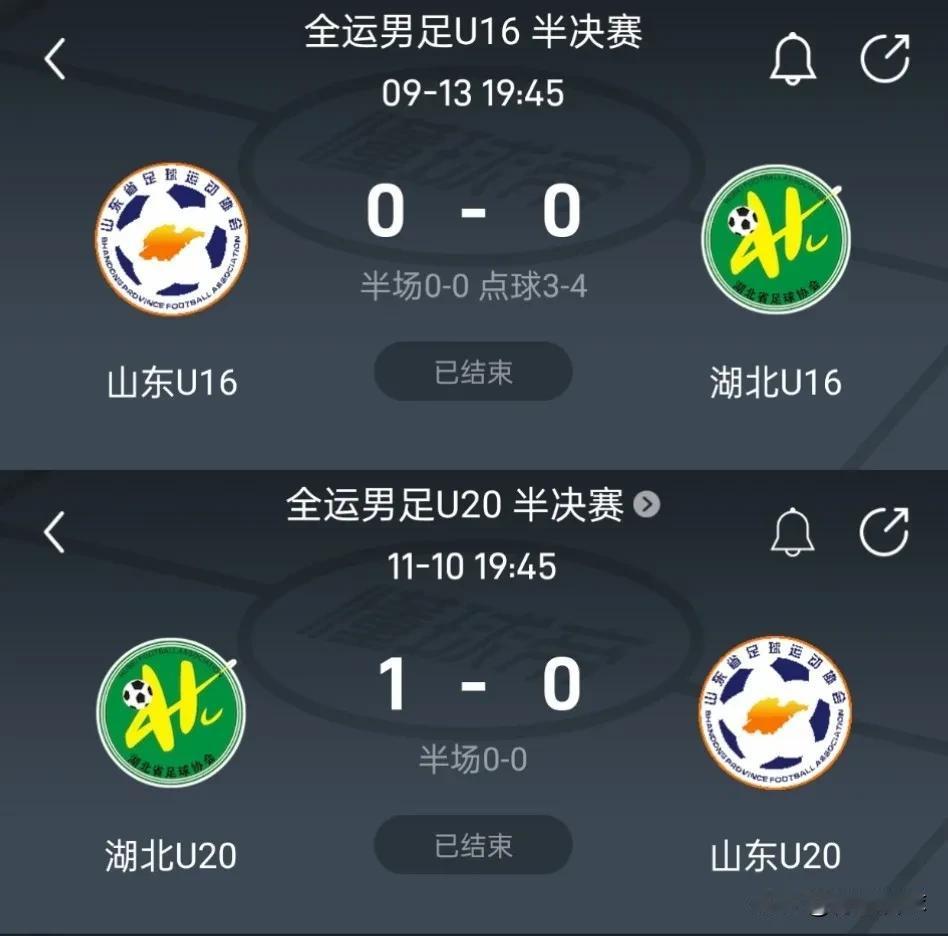 湖北双杀山东,U16和U20两支球队闯入全运会男足决赛。湖北足球有望取代山东,成为中国足球第一大省。 全运会男足U16半决赛,湖北4比3点球击败山东,晋级决赛。由于决赛对手北京队拥有很多清华附中的足球小将,湖北最终屈居亚军。 全运会男足U20半决赛,湖北1比0战胜山东,晋级决赛。湖北将在决赛与东道主广东争夺冠军。 湖北U20拥有U20国足主力右后卫杨希、U20国足后腰熊继政、青岛海牛主力左后卫韦所为等球员,具备夺冠实力。 继蒿俊闵、张稀哲、邓卓翔、曾诚、荣昊、明天、郑斌之后,湖北足球再次迎来黄金一代。