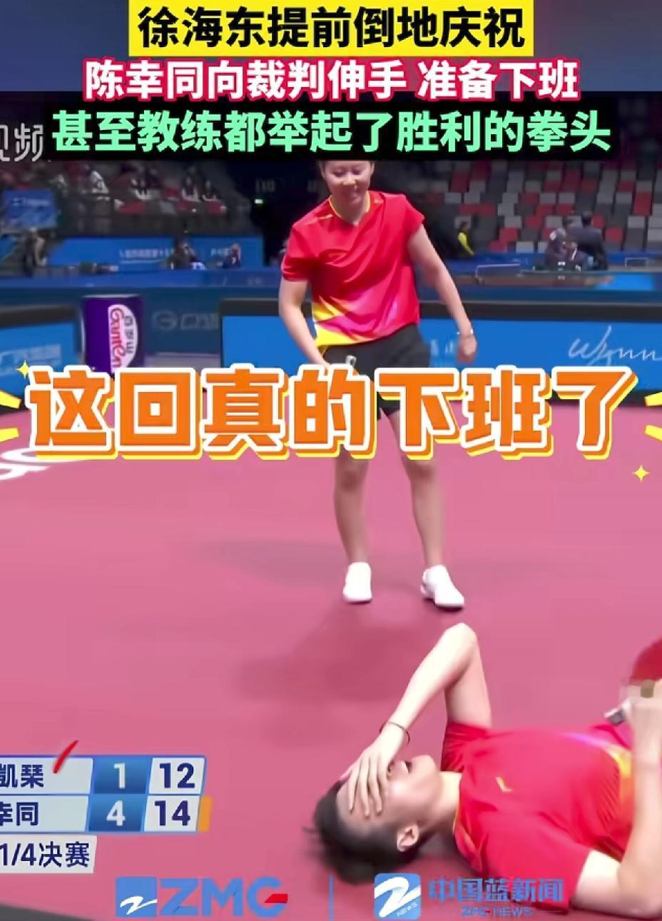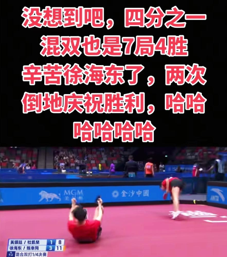 哈哈,笑不活了, 全运会混双比赛戏剧性一幕, 还真是一群世界冠军, 争夺一个全国冠军, 给整懵了。 全运会真是刺激又好玩, 混双1/4决赛, 徐海东/陈幸同对战黄镇廷/杜凯琹。 打到3:1的时候, 辽宁队以为自己已经赢下比赛了。 徐海东倒地庆祝, 运动员之间都握完手了, 教练都举手庆祝上了, 结果裁判说是七局四胜制。 哈哈,都要下班了, 通知继续打, 这乌龙事件真有意思。 一般的比赛混双都是五局三胜, 这次全运会是根据奥运会的标准来的, 从混双1/4决赛开始都是7局4胜制。 更好玩的是打满7局之后, 徐海东/陈幸同最终4:1成功晋级, 徐海东竟然又倒地庆祝。 一场比赛, 运动员倒地庆祝两次, 双方运动员握手两次, 估计也是前无古人后无来者了吧。 (图片源自于网络) 带定位晒今日生活 我的今日状态:💰期待暴富 我这里的天气:☀️晴天