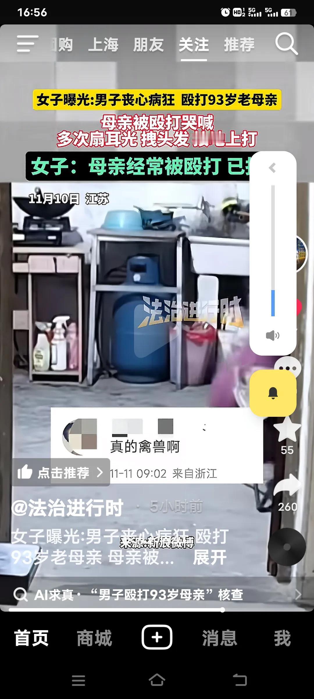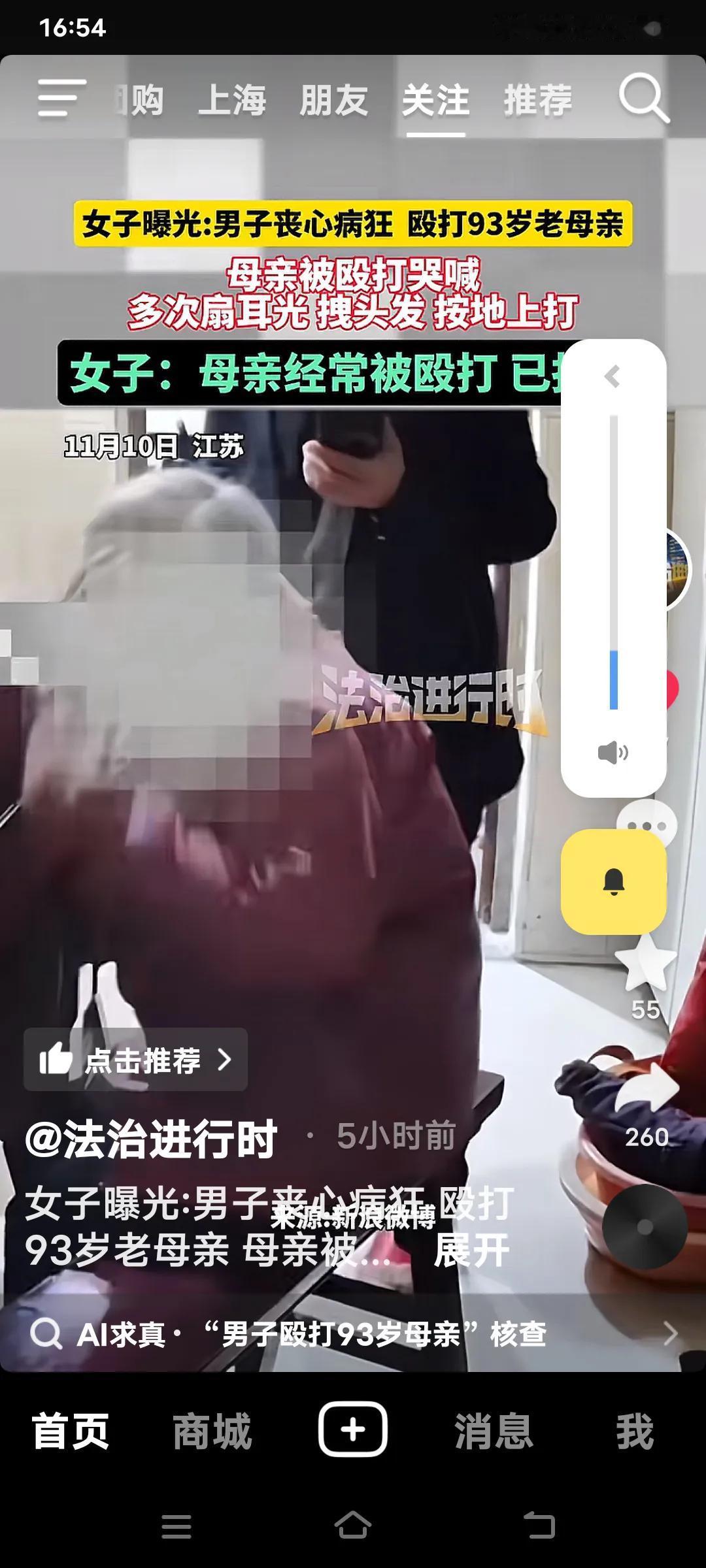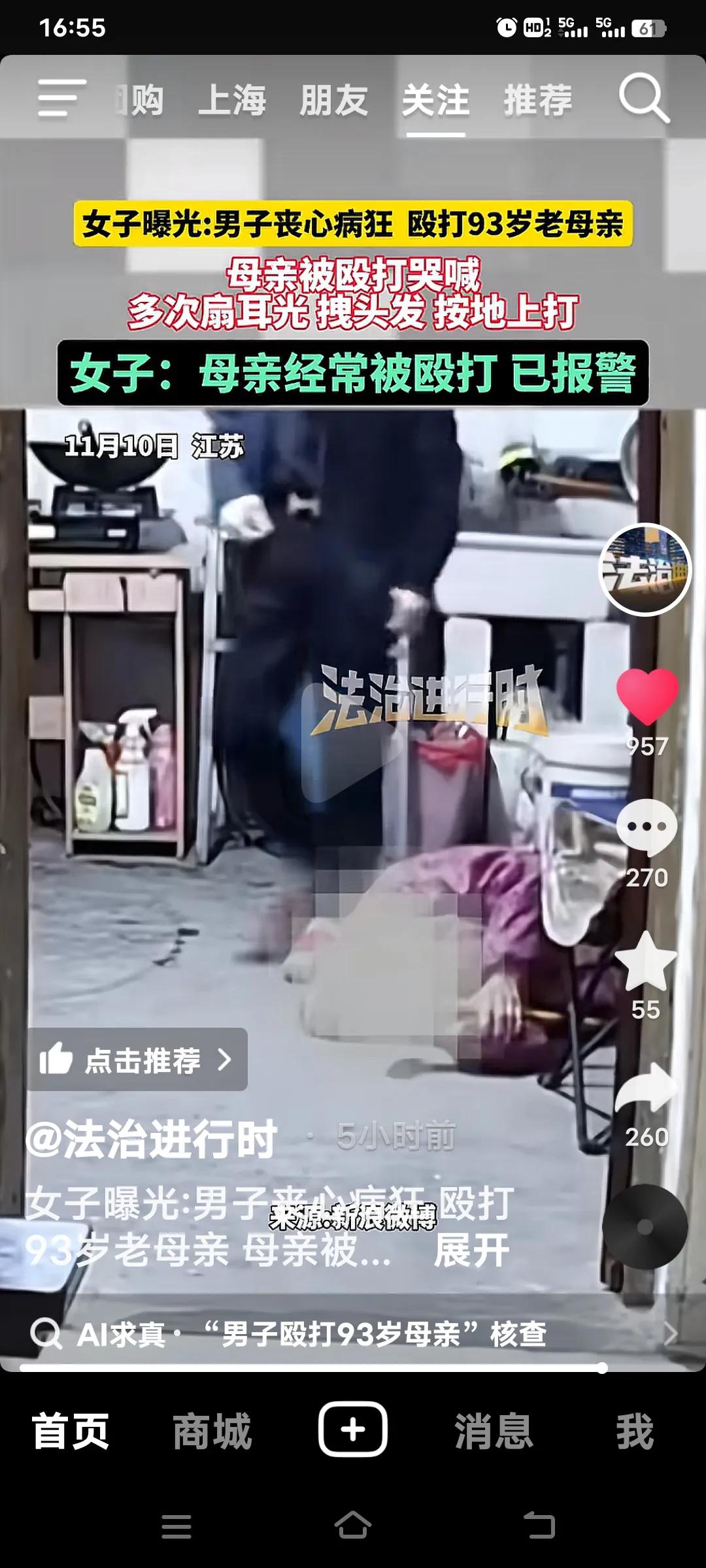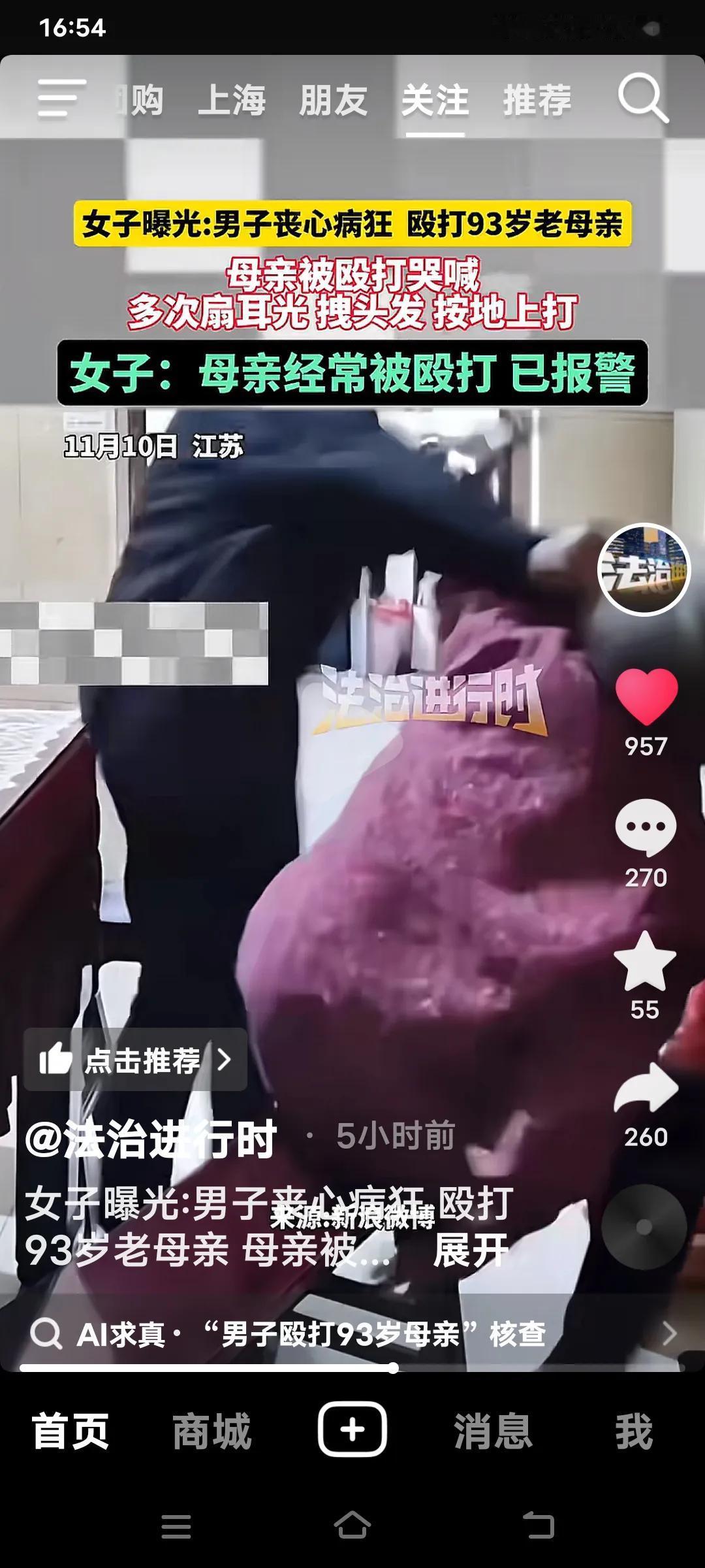 江苏一女子曝光的监控视频,着实令人义愤填膺!画面中,一名男子对着93岁的老母亲拳脚相向,又是扇耳光,又是拽头发,还将老人拉扯着摁倒在地,老人只能痛苦地哭喊。然而,这哭喊并未让男子停手,他依旧继续施暴。 老母亲已然93岁高龄,走路都艰难,哪有气力反抗。俗话说,生养之恩大于天,母亲含辛茹苦将他养大,他却这般对待母亲,实在是丧尽天良。目前,此事有了新进展,打人者男子杨某中已被抓获。真心希望这种虐待老人的人能受到应有的惩处! 究竟是何缘由,让这位中年男子对母亲大打出手呢?是觉得母亲年事已高成了拖累,还是母亲没钱给他?但无论如何,这都绝不是他殴打老人的借口。有人骂他简直就是畜牲!还有网友说,应该让他上央视新闻露露脸,让他尝尝以后自己孩子也如此对待他的滋味!殴打古稀老人 殴打中风老人