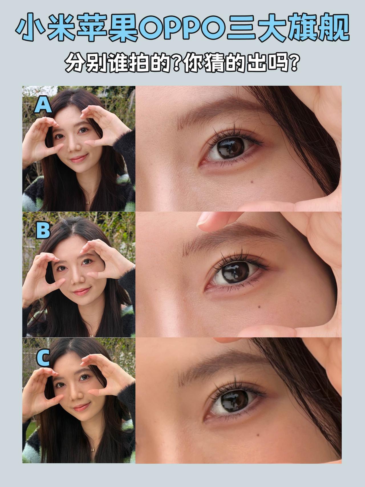 果米O三大旗舰实拍,不看答案你猜得出吗? iPhone 17、小米17 Pro以及OPPO Find X9三大热门旗舰,拍照都很强,你能分辨出ABC三张样张分别是哪台机型拍的吗?图5公布答案! 其实这3台风格差异很明显的,iPhone就是比较真实的原相机风格。小米美颜效果很明显,人脸白皙不少,美颜给够。OPPO有美颜但更自然点,有丹霞镜头色彩表现更好,有相机感,像摄影师拍的。 我自己会更喜欢OPPO这种风格,介于果和米中间,没有数码味,美颜也不会假假的,肤色、唇色自然,大家更喜欢谁的风格呢?