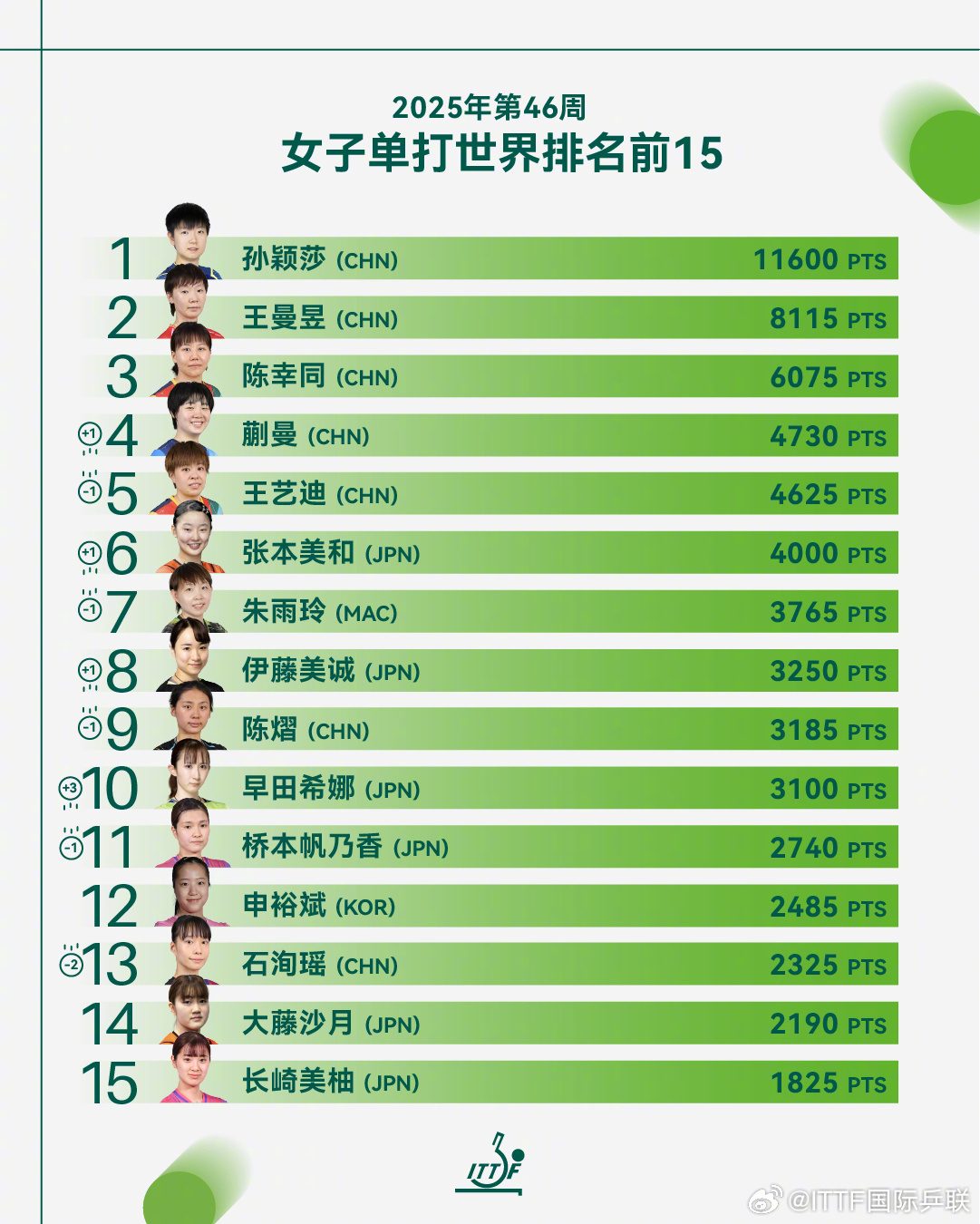 【】11月11日,国际乒联公布2025年第46周世界排名。女单方面, 11600分连续第174周霸榜第一, 8115分排名第二, 6075分排名第三。男单方面, 10900分排名第一, 7425分排名第二,一起为国乒加油!(ITTF国际乒联)