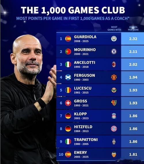 常胜!千场教练场均拿分排行:瓜帅2.32分居首,穆帅第二随着曼城战胜利物浦,曼城主帅瓜迪奥拉也就此达成执教千场里程碑。据德转数据显示,显示他也是场均拿分最高的千场教头。千场名帅场均拿分榜:1.瓜迪奥拉(2008-2025):2.32分2.穆里尼奥(2000-2021):2.11分3.安切洛蒂(1995-2018):2.02分4.弗格森(1980-2003):1.94分5.卢塞斯库 (1981-2015):1.93分6.克里斯蒂安·格罗斯 (1993-2021):1.93分7.克洛普 (2001-2023):1.86分8.希斯菲尔德 (1984-2013):1.86分9.特拉帕托尼 (1980-2005):1.86分10.埃梅里 (2005-2025):1.81分