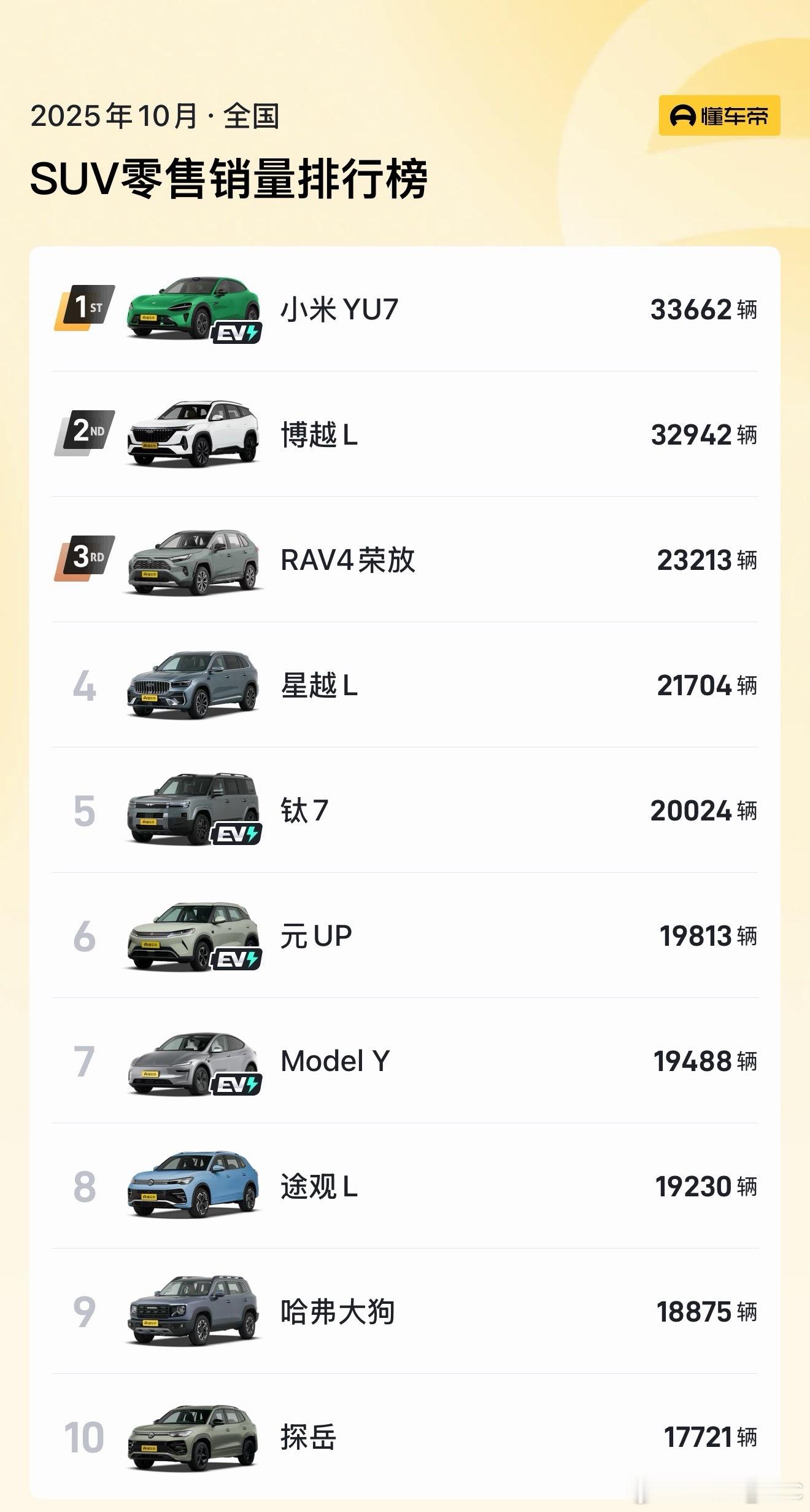 小米YU7 10月份卖了33662台,已经变成无任何定语,无任何能源形式SUV里的销冠。打特办小米干成了SU7把model 3干了,YU7把model y干了,就问你服不服