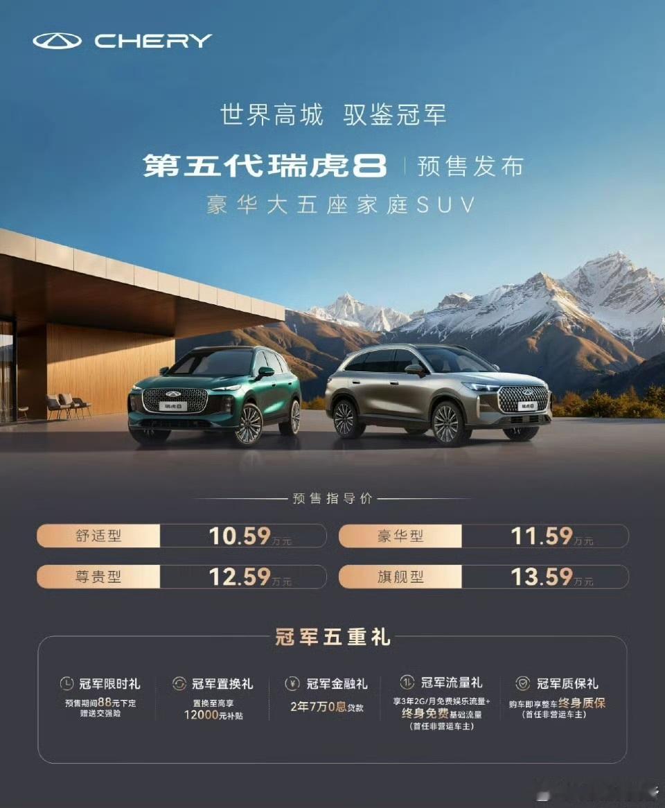 全新奇瑞瑞虎8正式上市,新车作为家族第五代产品,以极具竞争力的限时抢鲜价9.29万元至12.29万元登场(官方指导价9.99-12.99万元),共推出四款配置。提供了“虎款”与“豹款”双前脸造型与双内饰风格选择,分别契合沉稳家用与个性运动的不同审美需求。新车车身尺寸为4749/1880/1710mm,轴距达到2825mm。内饰方面,虎款车型配备15.6英寸横向中控屏,豹款则搭载13.2英寸竖向中控屏,两者均匹配10.25英寸液晶仪表,并全系标配高通8155芯片。动力系统全系搭载奇瑞自研的鲲鹏1.6TGDI缸内直喷涡轮增压发动机,最大功率147千瓦,峰值扭矩310牛·米,传动系统匹配7速湿式双离合变速箱。