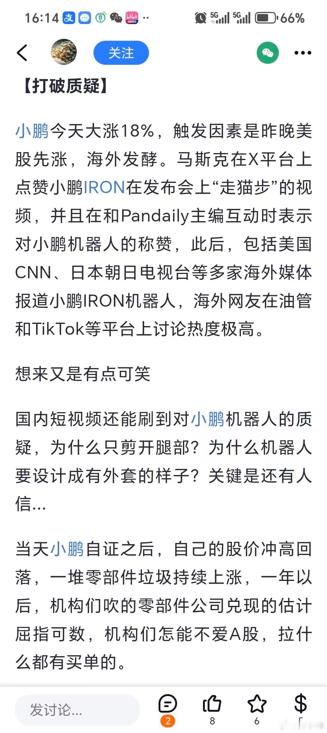 小鹏今天大涨18%,触发因素是昨晚美股先涨,海外发酵。马斯克在X平台上点赞小鹏IRON在发布会上“走猫步”的视频,并且在和Pandaily主编互动时表示对小鹏机器人的称赞,此后,包括美国 CNN、日本朝日电视台等多家海外媒体报道小鹏IRON机器人,海外网友在油管和TikTok等平台上讨论热度极高。想来又是有点可笑国内短视频还能刷到对小鹏机器人的质疑,为什么只剪开腿部?为什么机器人要设计成有外套的样子?关键是还有人信...当天小鹏自证之后,自己的股价冲高回落,一堆零部件垃圾持续上涨,一年以后,机构们吹的零部件公司兑现的估计屈指可数,机构们怎能不爱A股,拉什么都有买单的。