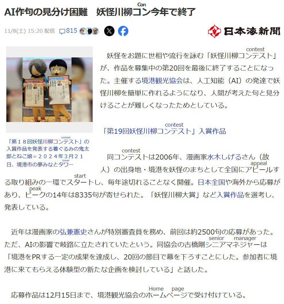 AI写诗难以分辨,水木茂故乡诗歌比赛宣布停办据日本海新闻报道,以“妖怪”为主题、吟咏世态与流行的「妖怪川柳大赛」将在正在征集作品的第20届后画上句点。主办方境港观光协会表示,由于人工智能的发展,使得创作妖怪川柳变得十分容易,已难以分辨哪些作品是人类所作,因此决定结束活动。该大赛始于2006年,作为宣传漫画家水木茂(已故)故乡境港“妖怪之城”形象的一项活动,自创办以来每年不间断举办。来自日本各地乃至海外的投稿络绎不绝,2014年达到高峰,共收到8335首作品。评选出的优秀作品包括“妖怪川柳大奖”等,均会公开发表。