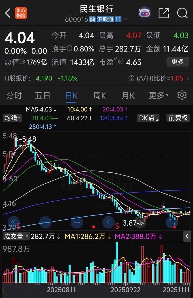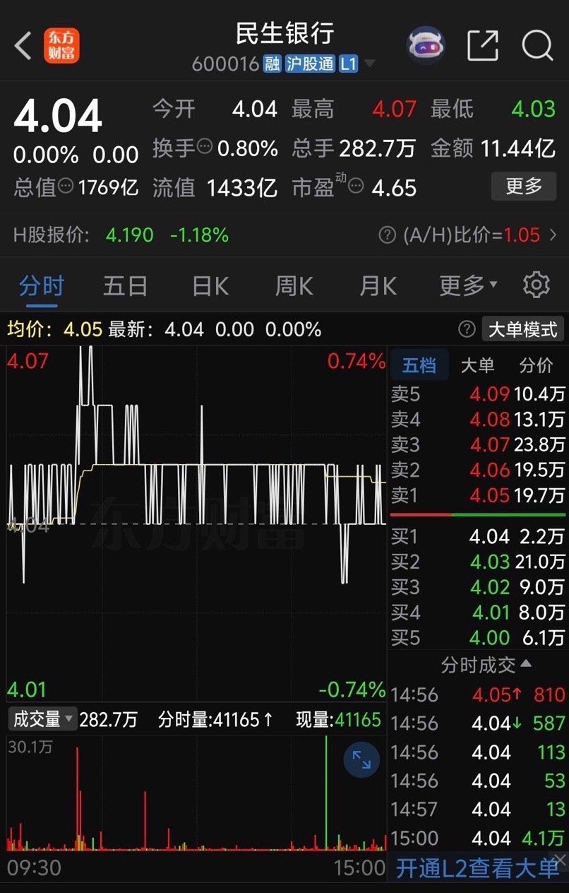 民生银行真的问题很严重,天天被几十万手卖盘压着起不来,每股12.83的净资产股价被打压到4元附近,有时候甚至还不到4元,股价不到农业银行的一半,甚至不到招商银行的十分之一,而且被很多地方小城商行超过了。早盘好不容易涨了2分后来又出现几万手几万手砸盘,午后出现一笔十几万手砸盘和连续的几万手砸盘甚至一度翻绿了。民生银行真的被打压的太惨了,大盘3000点的时候股价4元多,现在大盘4000点了,股价还是4元,很多股民熬不住纷纷割肉,很可能去炒题材股了,可是炒题材股一不小心追高下跌就不是10%20%这么简单,长线价值投资者还是守住民生银行比较保险,现在虽然被打压不涨,但是市净率仅仅只有0.31基本上没有下跌空间,千万不要割肉了。