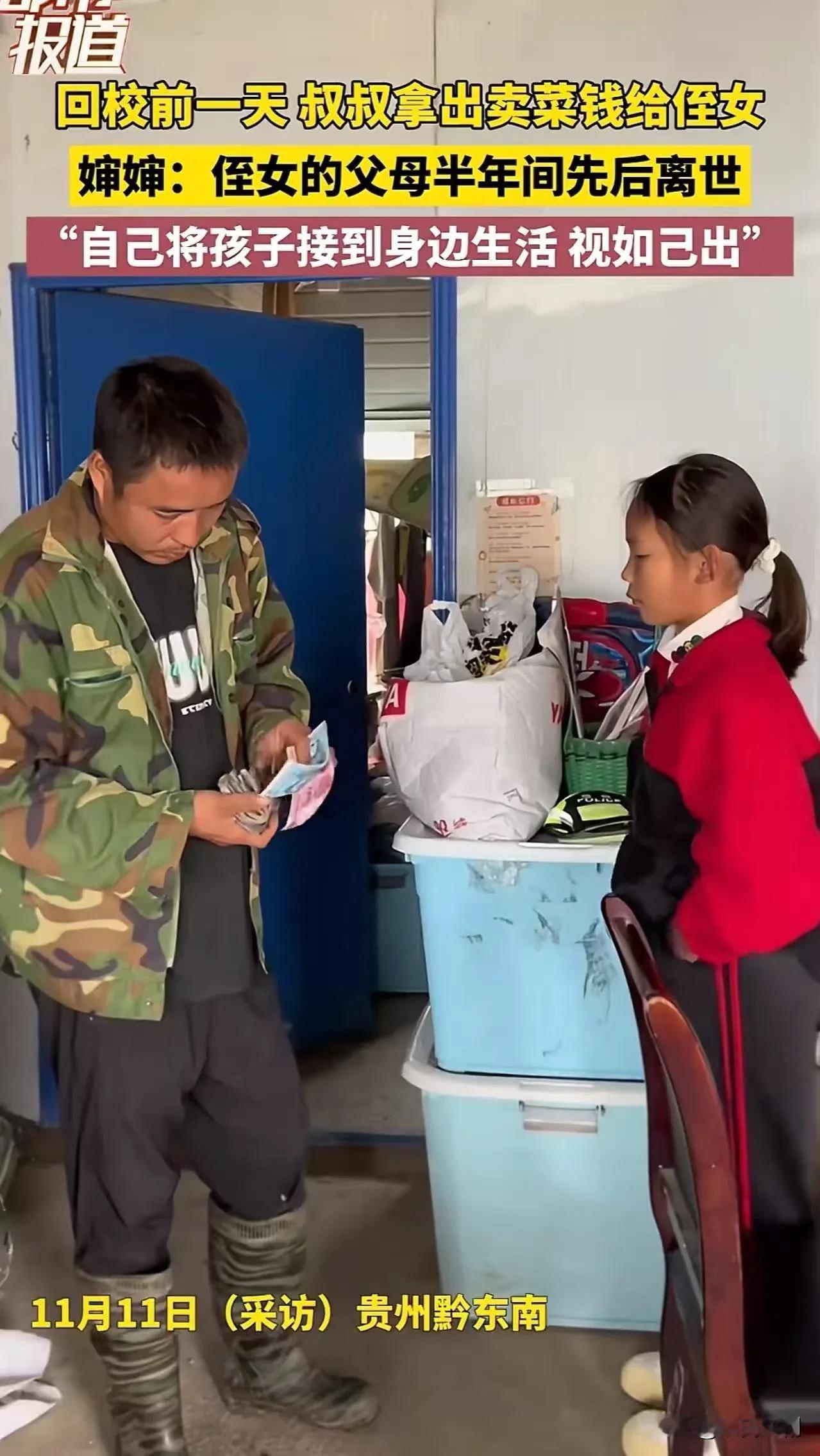近日,贵州一件温馨感人之事引发了社会广泛关注。故事主角是一对普通的叔叔婶婶,哥哥嫂嫂去世后,他们毫不犹豫地肩负起抚养侄女的重任,以实际行动彰显了家庭的温暖与责任感。 事情源于哥哥嫂嫂不幸离世,留下两个年幼的侄女。弟弟在痛失亲人的悲伤中,毅然将两个侄女接到家中抚养。为让孩子们过上正常生活,他每日辛勤劳作,靠卖菜赚取微薄收入,用以支付侄女的学费和生活费。回校前一天,弟弟拿出辛苦赚来的钱,打算给侄女买学习用品或零用钱。这一细节,尽显他对孩子们的关爱与责任。 婶婶在一旁也表达了对侄女们的深厚情感:“侄女的父母半年间先后离世,我们是孩子唯一的依靠,对她们视如己出!”这句话道出了一家人对侄女们的真心关怀,也体现了他们对家庭责任的担当。 这对叔叔婶婶的举动令人动容。他们以实际行动诠释了家庭的温暖与责任,展现了中华民族孝亲敬老、扶危济困的传统美德。在现代社会,家庭责任感尤为关键,他们的事迹提醒我们,每个人都应在力所能及的范围内,关心并帮助身边有需要的人。 社会应关注并支持像他们这样的家庭,为困难家庭提供更多帮助与资源,让这些充满爱心的家庭成为社会的温暖力量。同时,也希望更多人能学习他们的善良与担当,用爱心温暖社会的每个角落。 这对叔叔婶婶的故事告诉我们:家庭责任不只是血缘的维系,更是责任与爱的体现。从他们身上,我们看到了人性中最美好的一面,也激励着更多人传递这份温暖与善良。
