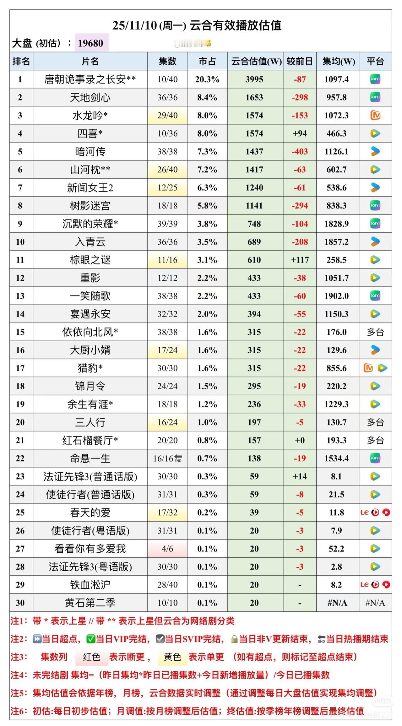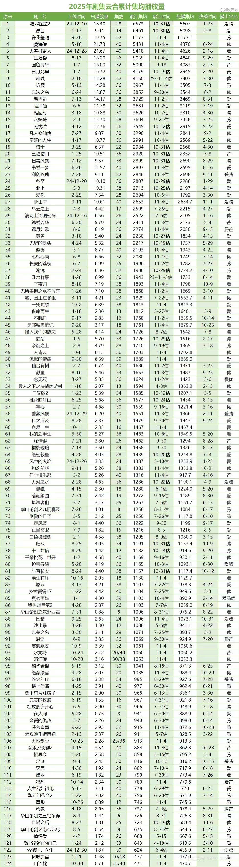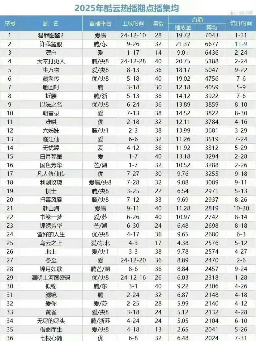 2025云合,酷云,集均前十排名! 总年冠:《许我耀眼》 联播年冠:《猎罪图鉴2》 优酷年冠:《藏海传》 腾讯年冠:《许我耀眼》 爱奇艺年冠:《漂白》 芒果年冠:《国色芳华》 一月冠军:🐧🥝《猎罪图鉴2》 二月冠军:👖《难哄》 三月冠军:🐧《雁回时》 四月冠军:🥝《无忧渡》 五月冠军:👖《藏海传》 六月冠军:👖《以法之名》 七月冠军:🥝《朝雪录》 八月冠军:🥝《生万物》 九月冠军:🐧《许我耀眼》 十月冠军:预测是🥝《唐朝诡事录3》 云合前十名分别是《许我耀眼》《猎罪图鉴2》《漂白》《生万物》《大奉打更人》《藏海传》《国色芳华》《以法之名》《折腰》《难哄》! 酷云前十名分别是《猎罪图鉴2》《许我耀眼》《漂白》《大奉打更人》《生万物》《藏海传》《雁回时》《折腰》《依法之名》《朝雪录》你都看过哪一部? 这个榜单是云合官方榜单,有人会质疑,集数不同,开播时间不同,确实是这样,但如果看集均,那也存在,各平台日活差异,上星与网剧的差异,热播期差异,其实都会存在争议,所以各个榜单都看看没错的。 总之能进去年榜前十的肯定都是播的特别出色的剧。感觉今年整体剧集表现是比去年好的,制作精良的剧很多!