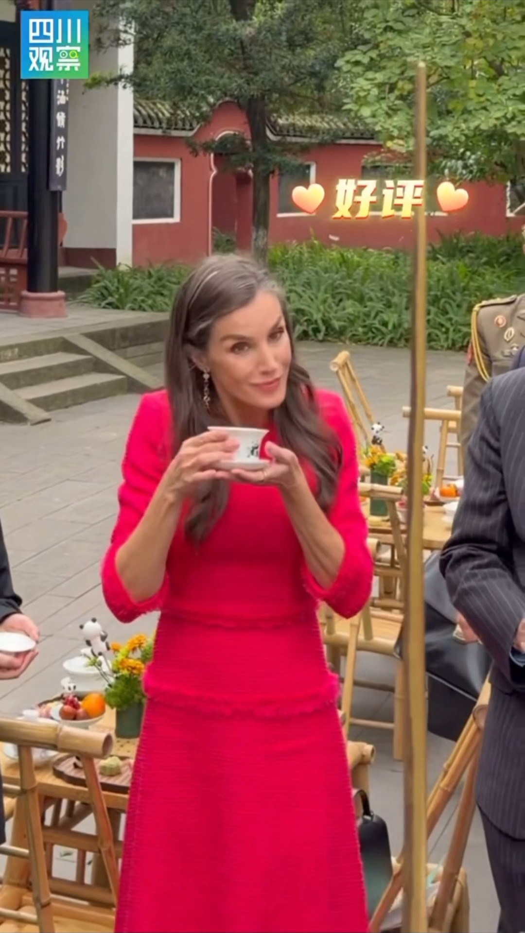 莱后在成都~红色象征繁荣和好运?好的,穿!品尝所有菜肴是礼貌?茶也算吧,好的,喝一口!(图:四川观察)