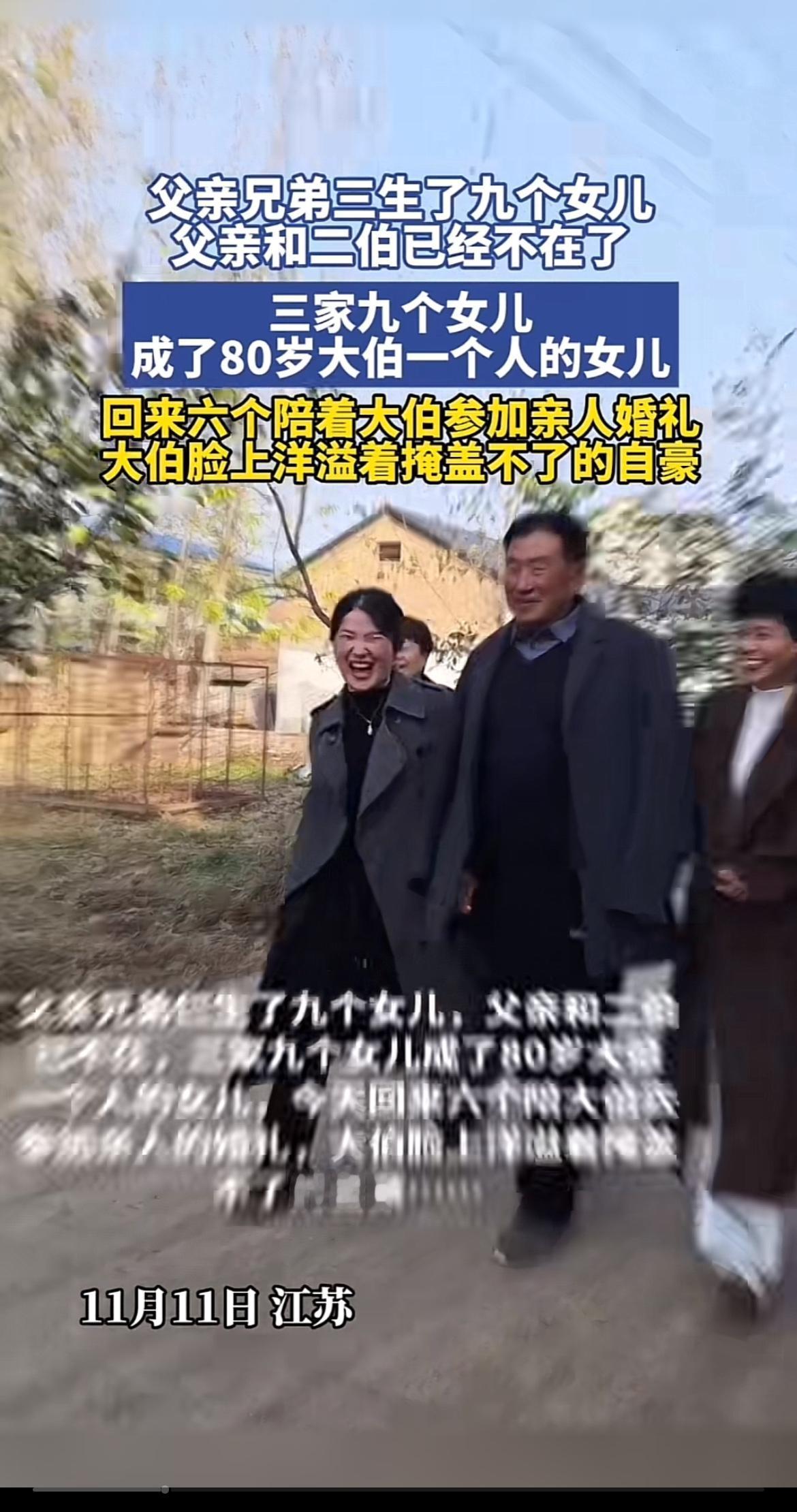 80岁大伯简直太有福气啦!居然有九个女儿陪他参加婚礼。想象一下那场面,九个女儿簇拥着大伯,那排面杠杠的。在婚礼现场,大伯脸上肯定洋溢着幸福的笑容,心里也乐开了花。有这么多贴心小棉袄在身边,他的生活一定充满了温暖。而且九个女儿能一起抽出时间陪他,这也说明家庭氛围相当和睦。对大伯来说,这绝对是幸福时刻的高光时刻,估计这场婚礼也会因为这份亲情变得更加难忘。