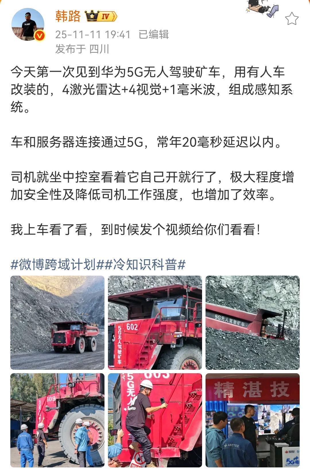 韩路:今天第一次见到华为5G无人驾驶矿车,用有人车改装的,4激光雷达+4视觉+1毫米波,组成感知系! 下一步的矿车就是最后一张图,无人矿车,无需人工干预,可以自主更换电池,意味着该车每天从运行开始到运行结束,都不需要人工干预,根据程序或指令自动运行。 各位是怎么看的?欢迎评论区留言。