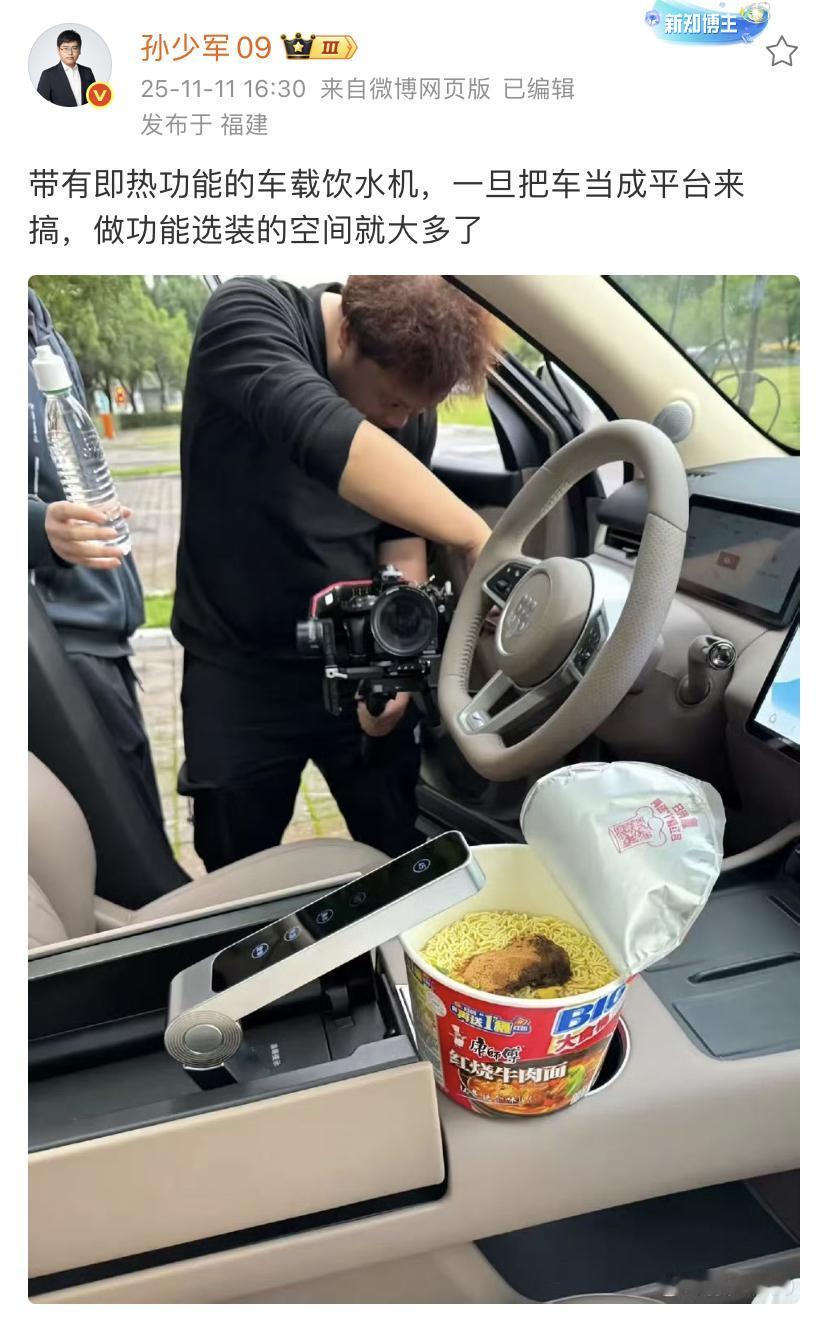 孙少军:国产车企做出来的车,还能泡方便面呢! 带有即热功能的车载饮水机,一旦把车当成平台来搞,做功能选装的空间就大多了。 个人感觉这个非常好,虽然大多数人没有这个需求,但是可以为消费者选装,这个以前油车没有办法实现电车可以的玩法实在是太多了。 各位是怎么看的?欢迎评论区留言。