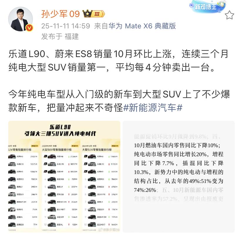 孙少军:乐道L90、蔚来ES8销量10月环比上涨,连续三个月纯电大型SUV销量第一,平均每4分钟卖出一台! 确实是非常的神奇,未来集团进入9月份之后,一下子就翻起来了,他们的众多产品一下子就变得非常好卖了,感觉还是价格到位了,产品力提升上来了。 大家有一种划算的感觉,对比同级别车型,蔚来的价格也不贵,蔚来的车还有一个巨大的优势,就是可以换电。这在长途自驾中非常的有利,特别是逢年过节需要远距离出行,这个体验是其他车没有办法达到的。 各位是怎么看的?欢迎评论区留言。