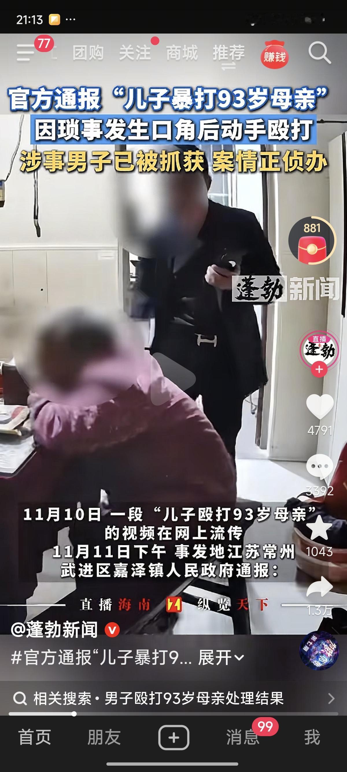 【气愤!儿子暴打93岁母亲,这种行为必须严惩!】 11月10日,一段“儿子殴打93岁母亲”的视频在网上疯传,画面里男子对白发苍苍的老母亲又扇耳光又拖拽殴打,下手之狠让人看得揪心! 这事发生在江苏常州武进区,当地政府11日通报,涉事男子杨某中已被抓获,具体案情正在侦办中。 百善孝为先,对自己93岁的母亲下此狠手,简直是突破了做人的底线!希望法律能严惩这种不孝行为,也希望老人能得到妥善的照顾。