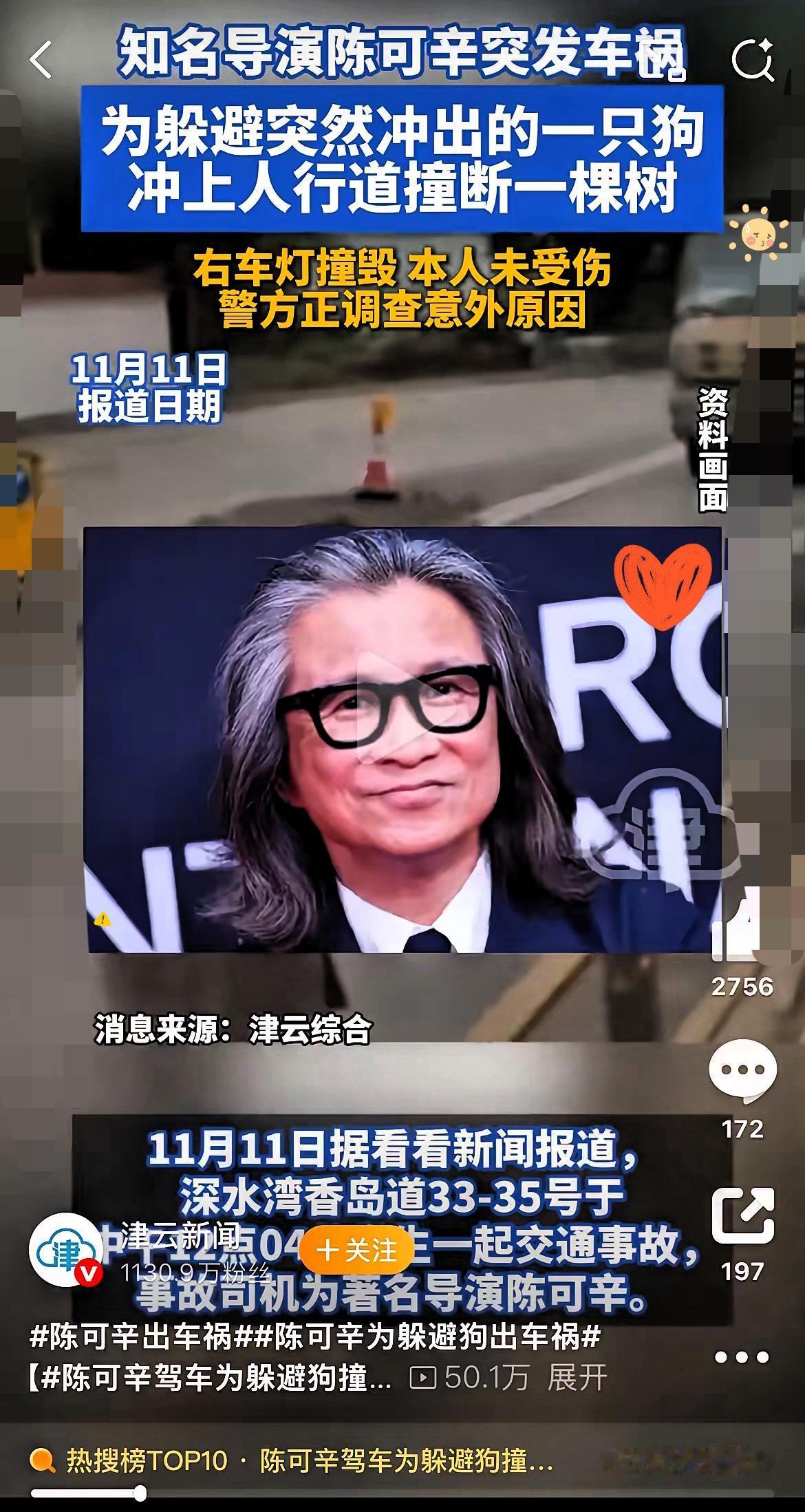 两大导演热搜对比! 陈可辛为躲狗车祸,王家卫输在人品 这波对比太戳心了!王家卫和陈可辛万万没想到,同是名导上热搜,却因人品高下立判! 11月11日中午,陈可辛开车时为躲避突然冲出的狗狗,不慎引发车祸,撞断树木、撞毁车灯,好在人无大碍。 为了一条小生命宁愿自己遇险,这份对生命的敬畏,活该被命运眷顾。 反观王家卫,因编剧署名争议深陷舆论,被指不懂尊重创作者。 一个敬畏动物生命,一个连人都不愿尊重,没有对比就没有伤害。导演的立身之本从不是作品光环,而是藏在细节里的人品。 你觉得人品对创作者来说有多重要?来评论区聊聊!