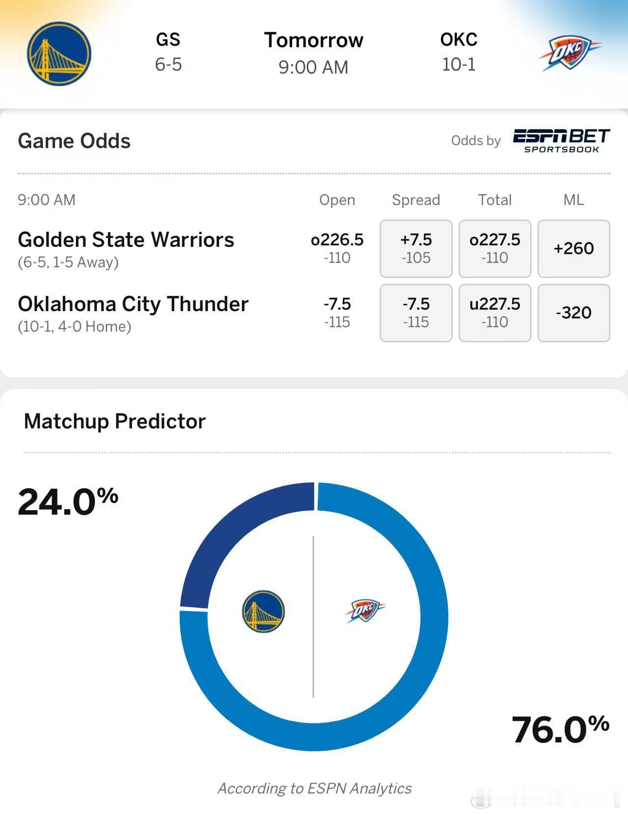 比赛预告:明天早上9:00,勇士开启六连客场之旅第一站——俄克拉荷马雷霆。打强队,希望我们能看到有信念的勇士勇士伤病报告:霍福德(伤病管理)出战成疑、图希(膝盖)赛前决定、梅尔顿(膝盖)缺席雷霆:杰伦威廉姆斯(手腕手术)、多尔特(上斜方肌拉伤)、阿隆维金斯(内收肌拉伤)、肯里奇威廉姆斯(膝盖手术)、托马斯索伯(前交叉韧带撕裂)、尼古拉托皮奇(睾丸手术)6人缺席ESPN预测双方胜率:勇士24%,雷霆76%,雷霆-7.5分