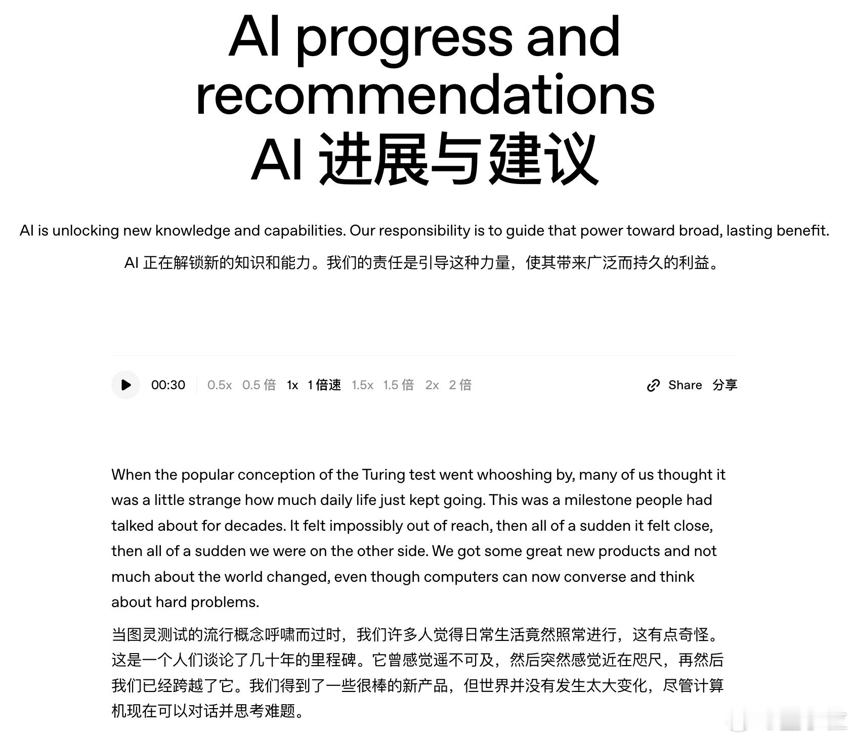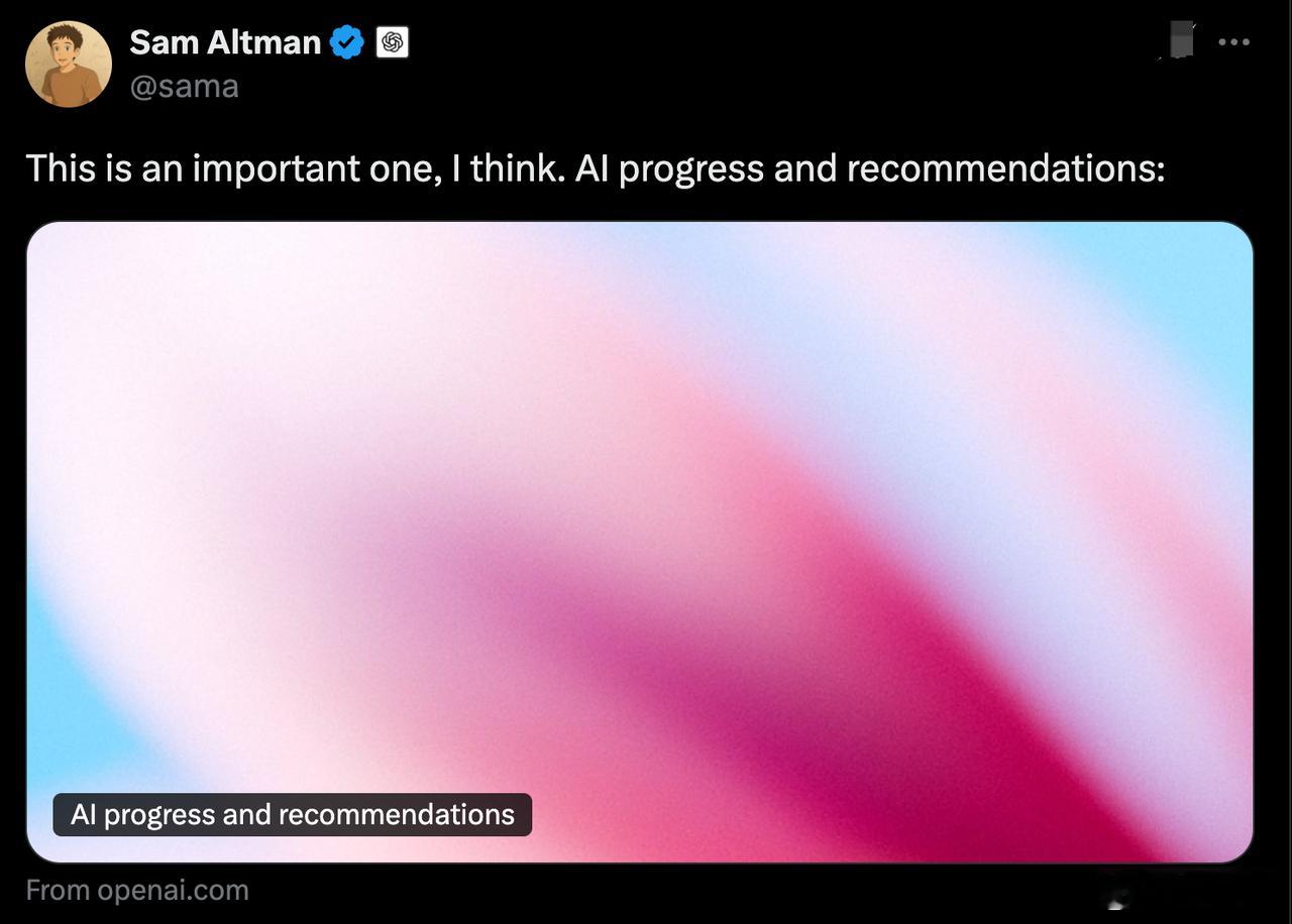 OpenAI CEO奥特曼发了篇AI进展与建议的文章,涵盖了OpenAI对未来AI发展的时间判断、安全标准设想。简单总结一下文章的观点:1. AI已经超越大众想象 大多数人还是在用AI写写文案、搜搜资料,但前沿模型已经在认知难度上超过人类,比如解决高难智力任务、发现新知识等。从“帮你自动写代码”到“能做你几天才搞定的任务”,只用了几年。2. AI能力增长速度惊人 OpenAI估计,单位智能的花费每年降低40倍,且AI自己能做的事越多,协助人类发现新事物的能力也在指数增长:- 到2026年,有望实现“微小发现”- 到2028年,可能出现“重大突破”3. AI进步快,但社会变化慢 AI系统能力激增,人类生活却没那么快被刷新。大家还是日常上下班、看剧、刷新闻。AI进步是有,但与生活节奏未必同步。4. 接下来需要重点推动六件事 OpenAI列出的建议,核心都绕着“怎么让AI变强的同时变得可靠”,具体包括:- 建立前沿实验室共享标准,包括如何评估AI可控性、如何减少竞争加速风险等 - 推动合理监管框架,低风险模型少监管,高阶模型需协调国际力量 - 建立AI韧性生态系统,类似早年网络出现时的网络安全体系,包括协议、监测、应急响应机制等 - 增加对AI影响的可量化跟踪,帮助社会理解AI到底改变了什么,是加剧不平等,还是提升教育医疗水平 - 保障个体使用AI的权利,未来AI将成为基础设施,每个人应该能自由使用AI来达成个体目标 - 对于更远的未来,如自我改进型AI,要有预案,不排除需要全球范围内的协调管控体系介入4. AI是“公共物品”,但不是传统意义上的技术革命 OpenAI提到一个重要观点:AI不像互联网那样稳步发展,而可能发展得更快、更难监管。常规监督工具未必能完全应对,需要创新机制。整体来看,这是对AI发展非常坦率且前瞻性的判断,不光在鼓舞大家拥抱AI潜力,也在明确列出警示。 未来是否真会如预测般在2028年之前迎来技术飞跃?我们拭目以待。