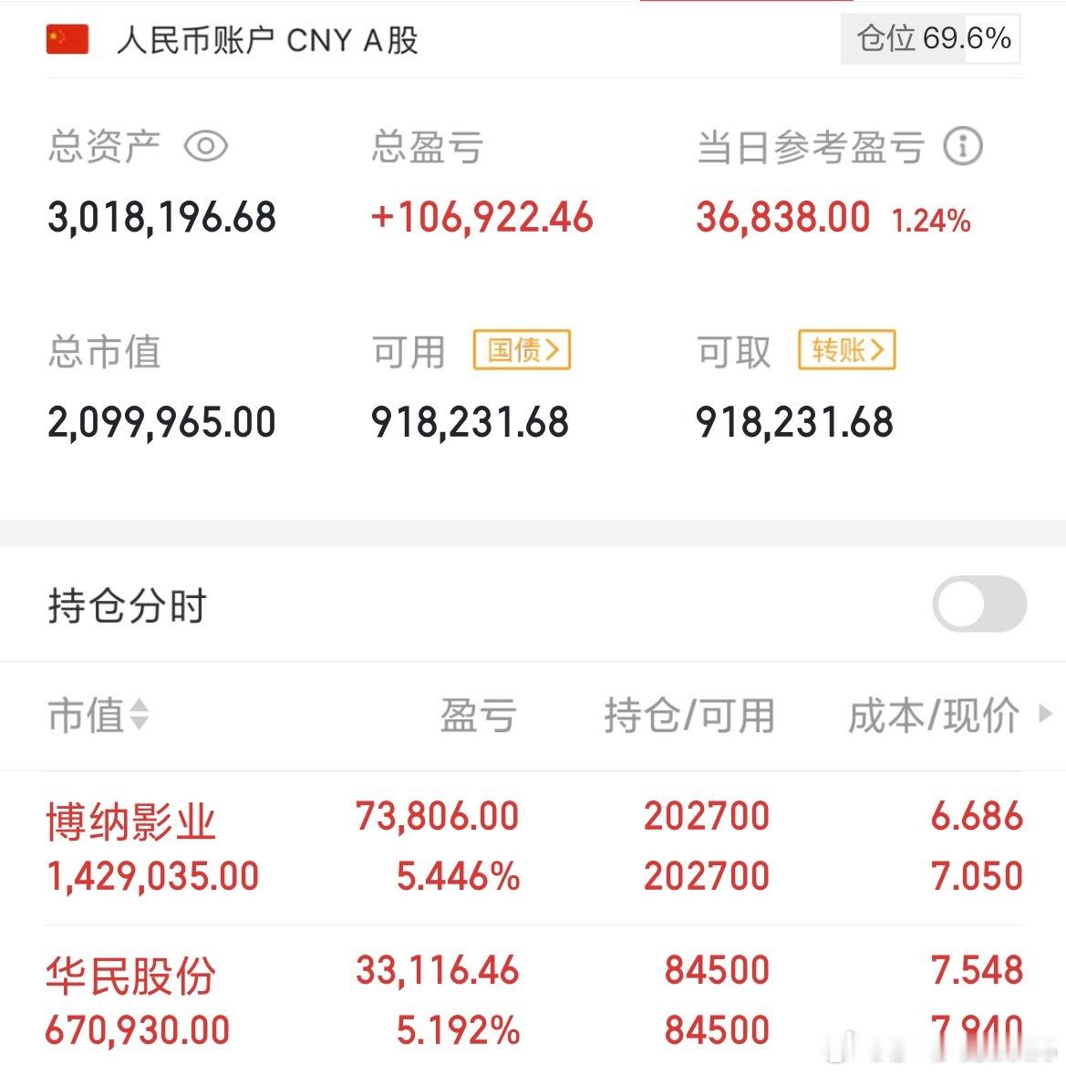 兄弟们,收工了,今天大盘果然跟莎莎预测的一样是调整的,所以莎莎昨天是小仓进的,所幸的是今天华民股份,博纳影业都涨了,虽然涨得不多,但是今天也赚了36838,有得赚就好