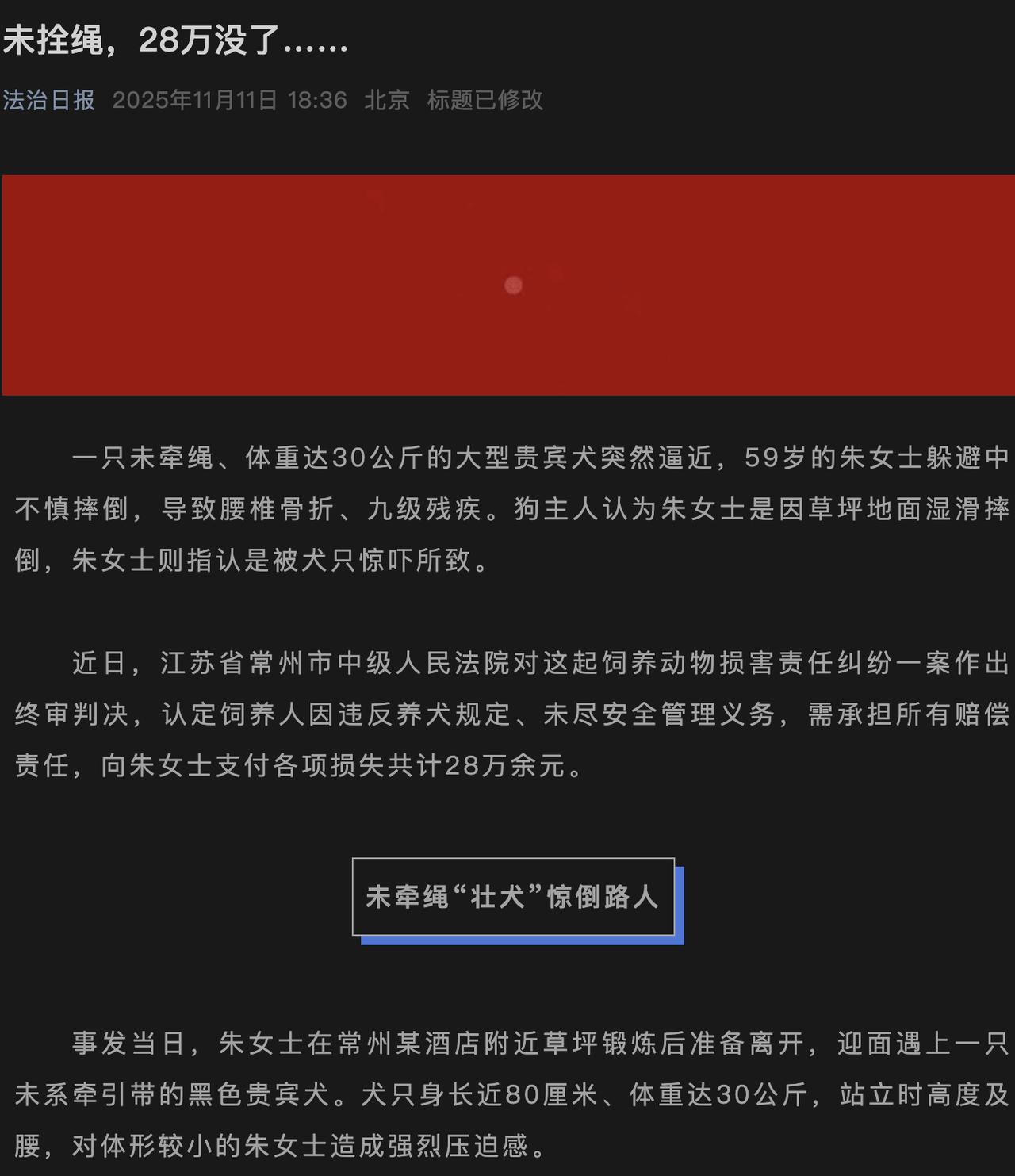 江苏常州,59岁身材娇小的女子锻炼完,在返回途中遇到大型没有牵狗绳的黑色贵宾犬朝自己跑来。女子躲避时不慎摔倒,造成九级伤残。狗主人3次陪同女子就医并垫付部分医药费,但30万的治疗费女子无法承受,双方协商未果起诉索赔。一审判决狗主人承担60%责任,赔偿17万余元。双方均不服,提起上诉,二审改判了! 59岁的朱女士很注重养生,每天的锻炼都必不可少。酒店附近的草坪边人少又安静,是锻炼身体的好地方,也是朱女士选择锻炼的首选地。 有次朱女士锻炼完准备离开的时候,抬头看到一条黑色贵宾犬朝着自己跑了过来。 这条黑色贵宾犬体型偏大,大概有30多斤重的样子,贵宾犬站起来有朱女士半身高。身材娇小的朱女士很害怕这样的大型犬只,下意识的就开始躲闪。 因心里害怕,一个不留神就摔倒了。朱女士大叫的声音引来了附近的另一位女士,这人正是贵宾犬的主人王某某。 王某某走近后,叫住贵宾犬。朱女士才知道原来狗是有主人的,于是赶紧跟王某某控诉贵宾犬朝着自己跑过来这件事。 朱女士一边控诉一边尝试着自己起来,但是一动就很痛。王某某见状赶紧将朱女士送医救治,经医生的诊断后得知,朱女士腰椎骨折。 造成朱女士摔倒骨折的,正是王某某饲养的贵宾犬,所以王某某有推脱不掉的责任。 王某某也从未想过要推脱责任,朱女士3次就医的时候,王某某都陪同着,而且都有垫付部分的医疗费。而且王某某还表示肯定会承担责任,让朱女士放心。 朱女士也不是故意要讹王某某赔偿,但是朱女士的伤情经过鉴定为九级伤残,伤得不轻,肯定要花不少钱。 经过治疗后,朱女士总共花费30多万的治疗费用。既然王某某说过要承担责任,那么这笔赔偿就应该由王某某负责。 但是王某某听到高额的治疗费用后,觉得朱女士摔倒造成的骨折,也没有证据证明是自己家的狗给扑倒导致的摔倒,所以不愿意赔偿。 朱女士本来从未担心赔偿的事,认为王某某肯定会承担责任的,但是王某某突然转变的态度却让朱女士措手不及。 朱女士尽量跟王某某沟通协商赔偿的事情,但是均未果,朱女士只能将王某某告上法庭索赔。 朱女士在锻炼时遇到身长80厘米,重达30斤的黑色贵妇犬,因贵妇犬站起来到达朱女士腰部的位置,对于朱女士来说属于大型犬只。 朱女士下意识躲避的时候摔倒导致骨折,朱女士认为狗主人王某某应该承担起饲养者的侵权赔偿责任。 根据《民法典》第1165条的规定:行为人因过错侵害他人民事权益造成损害的,应当承担侵权责任。 依照法律规定推定行为人有过错,其不能证明自己没有过错的,应当承担侵权责任。 朱女士骨折治疗花费30多万元,扣除掉王某某3次陪同治疗时垫付的钱,还应赔偿剩余的款项,因双方协商未果,所以提起诉讼。 法院审理后认为,王某某在室外遛狗时未对犬只拴狗绳,导致贵宾犬在王某某闭目养神时离开其身边朝着朱女士跑去,王某某存在过错。 而朱女士也没有尽到谨慎注意义务,在躲避犬只的时候导致摔倒受伤,朱女士也应该承担责任。 虽然王某某声称朱女士摔倒是因为草坪地面湿滑,但未能够提供充足的证据佐证。 因此一审法院认定朱女士应承担40%的责任,王某某应该承担60%的责任,王某某需要赔偿17.37万元。 双方对一审对判决结果均表示不服,提起上诉。 王某某二审抗辩表示,在案发当天,王某某是背对着朱女士闭眼在做瑜伽,没有人见证朱女士摔倒的全部过程,现有证据也无法证明朱女士摔倒是躲避犬只所致。 还表示朱女士已经59岁,在路面湿滑的情况下,很有可能是自己摔倒了。 朱女士则认为,自己提交的证据足够证明自己的摔倒与王某某未牵绳犬只之间存在因果关系。 王某某也没有提供证据能够证明朱女士存在故意,因此朱女士认为自己不应该承担任何责任。 朱女士还提供出王某某曾经承诺会承担责任的全部录音,以及报警的凭证等。 王某某认为录音里自己的承诺承担责任,是误信朱女士的确是被小狗吓到导致的摔倒,不能拿这样的录音当作认定因果关系的依据。 根据《常州市养犬管理条例》的规定:携犬出户时,必须为犬只佩戴牵引带,且牵引带长度不得超过1.5米。 王某某外出遛狗时并未对犬只佩戴牵引带,也没有采取任何约束措施,未能够尽到饲养动物的危险预防义务。 根据《民法典》第1246条的规定:违反管理规定,未对动物采取安全措施造成他人损害的,动物饲养人或者管理人应当承担侵权责任;但是,能够证明损害是因被侵权人故意造成的,可以减轻责任。 二审法院认为,从事发过程到事后王某某的处理经过、报警记录等,可以认定是王某某饲养的贵宾犬导致朱女士受伤。 王某某没有证据证明朱女士存在故意,应承担全部的赔偿责任。因此二审法院撤销一审判决,改判王某某赔偿朱女士28.62万元。