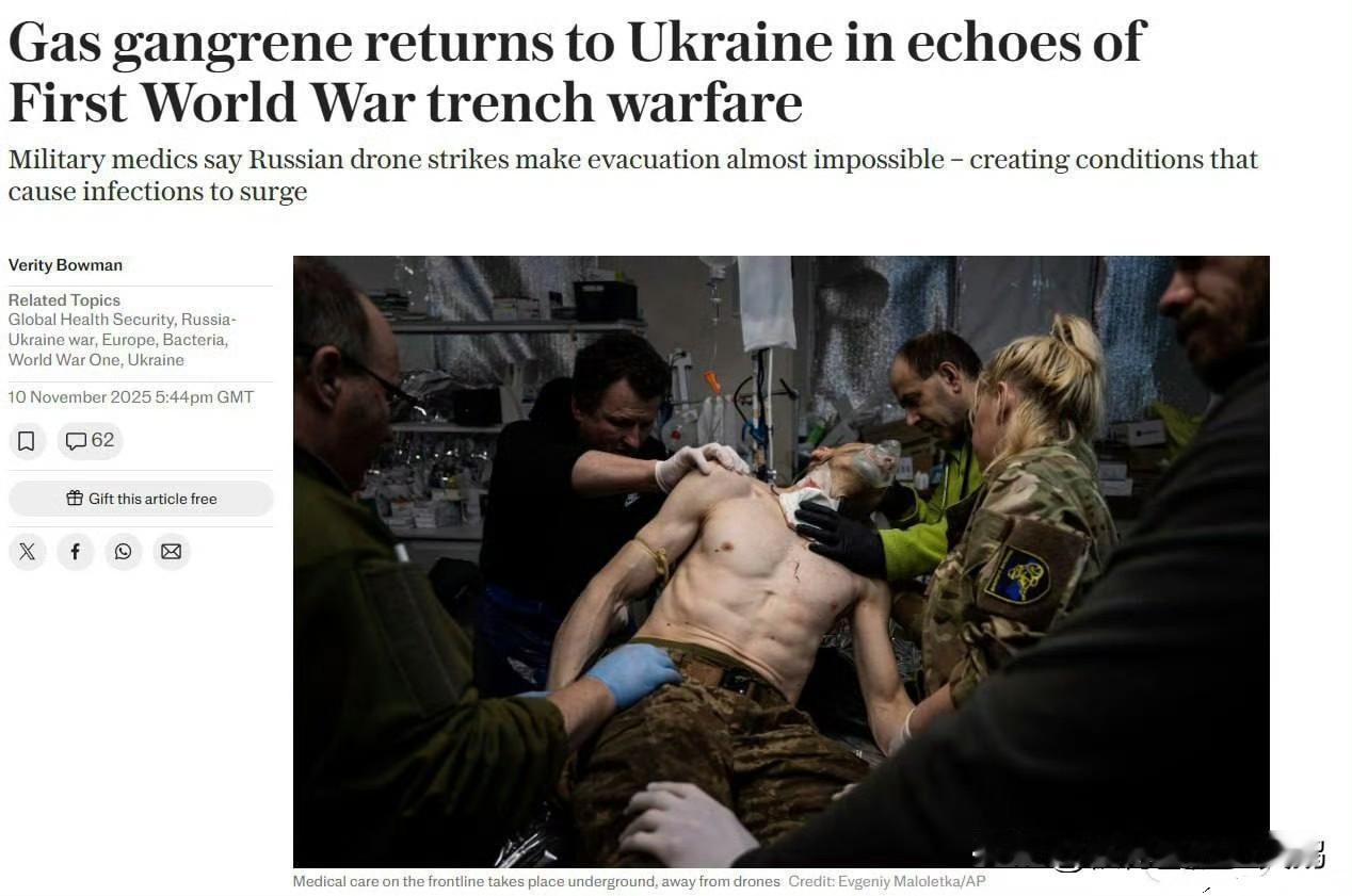 ⚡️《每日电讯报》报道: 乌克兰前线爆发致命感染——气性坏疽,这是一种第一次世界大战时期出现的疾病。 报道称,由于无人机袭击导致伤员后送困难,医疗人员发现气性坏疽疫情正在前线暴发。这种可怕的感染会摧毁伤病员的肌肉组织,可在感染的数小时内致人死亡。若未能及时获得医疗救助,死亡率接近100%。 #热点观点##俄乌冲突#