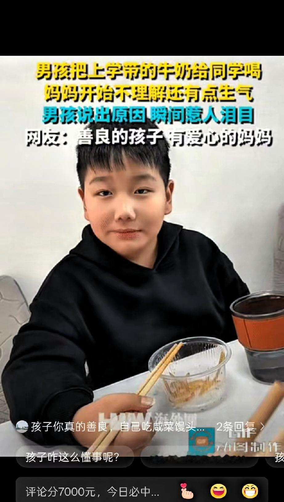 男孩自己吃咸菜馒头,却还总是把上学带的牛奶给同学喝 ,妈妈撞见好几次,心里又心疼又有点生气,回家后忍不住念叨:“你自己省吃俭用,别总把牛奶给别人了,他妈妈不会自己买吗?” 男孩抬起头,小声却认真地回了一句:“他没有妈。” 短短五个字,没有多余的情绪,却像一块小石头砸在妈妈心上,让她瞬间语塞,满心的责备都变成了愧疚。她赶紧改口:“那以后咱每天带两个,你和他一人一个,这样你也能喝上。” 本以为这就是最暖的结局,可男孩接下来的话,直接让人破防。他犹豫了一下,拉着妈妈的衣角小声问:“妈妈,能拿三个吗?” 妈妈愣住了,疑惑地看着他,男孩接着说:“他还有个妹妹,每次我给她的牛奶,他都舍不得喝一口,偷偷藏起来带回家留给妹妹了。” 听到这话,妈妈的眼眶瞬间红了。一个自己还在凑活吃饭的孩子,不仅惦记着没妈的同学,还把对方的妹妹放在心上,这份细腻又纯粹的善意,比任何昂贵的礼物都动人。 她紧紧抱着男孩,赶紧点头:“能,当然能,以后咱就带三个!” 母子俩相视一笑,这笑容里满是理解、温柔,还有对善良的共同坚守。 网友们纷纷被打动:“吃着咸菜馒头,却有着悲悯天下的格局,这孩子的人品已经满分了!”“物质上不富裕又怎样,他的精神世界比谁都丰盈,这份善良太珍贵了。” 是啊,成绩能衡量学识,却衡量不了人心。这个男孩或许没拥有太多物质财富,但他拥有最宝贵的共情力和善良心——知道别人的难处,愿意分享自己仅有的东西,哪怕自己过得并不宽裕。 比起逼孩子考高分、争名次,教会他们保持内心的柔软与善良,才是父母给孩子最有价值的财富。善良从不是吃亏,而是一个人行走世间最硬的底气,它能照亮自己的前路,也能温暖身边的每一个人。