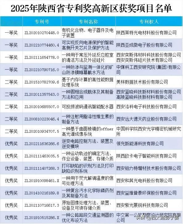 西安高新区太牛了!16项专利斩获2025陕西专利奖,这些黑科技涉及你生活的方方面面 2025年陕西省专利奖名单揭晓,西安高新区直接拿下16项大奖,其中一等奖4项、二等奖5项、优秀奖7项,数量质量双双领跑全省! 从光电材料、微电子到生物医药、环保科技,这些专利覆盖多个前沿领域,既是企业创新实力的证明,更是西安高新区作为“创新策源地”的生动写照。 不得不说,高新区把“硬科技”实力展现得淋漓尽致!