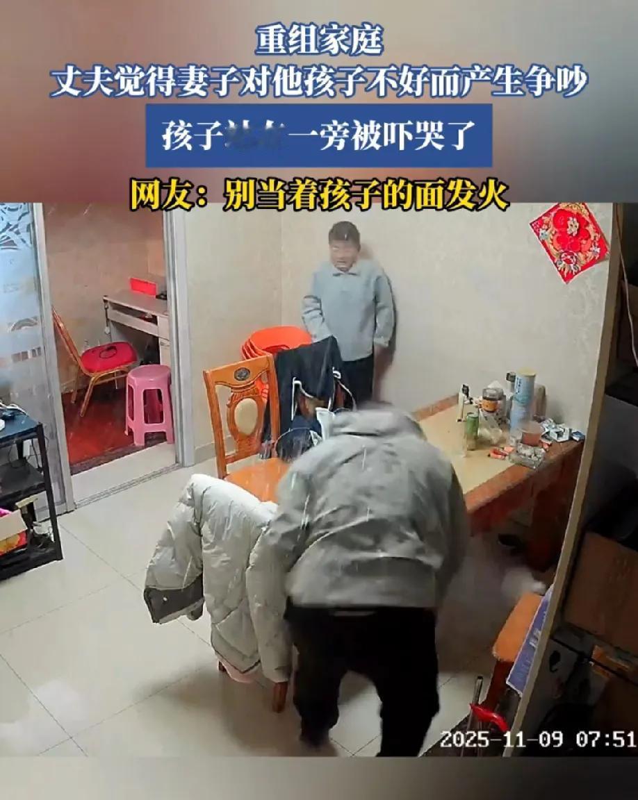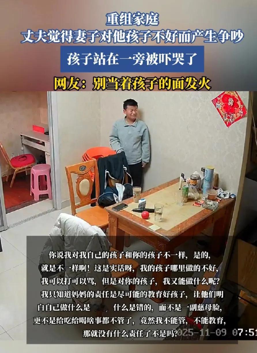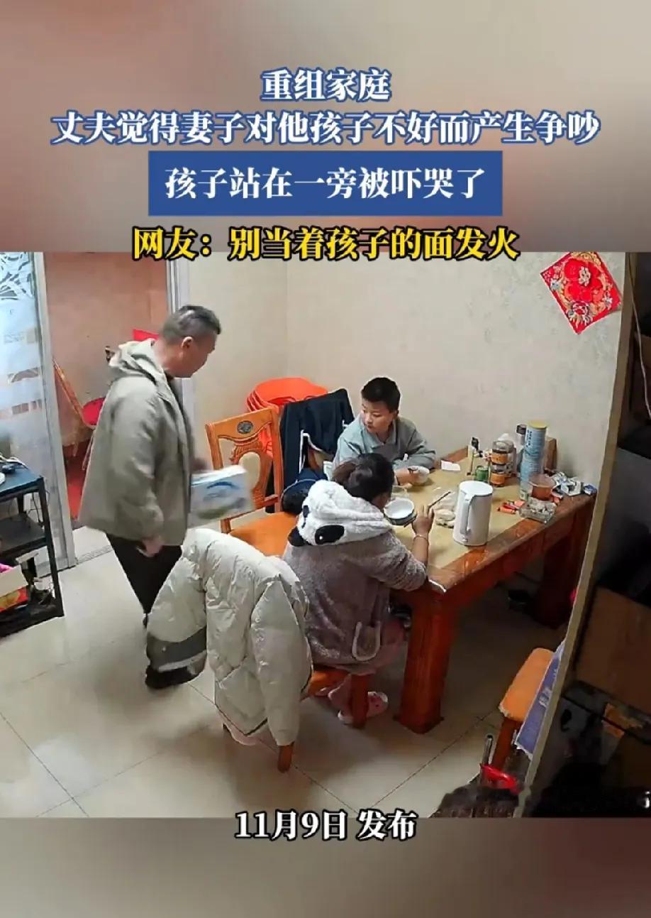 好吃不过蜜糖,难当不过后娘 重组家庭,丈夫觉得妻子对他孩子不好吵架,男子直接当着孩子的面摔了热水壶,孩子站在一旁被吓哭了。 这就是亲生与不亲生的区别,自己亲生孩子,错了可以打可以骂。但是别人的孩子,管多了别人会记恨,管少了说不上心,后妈难当啊! 有过一次失败婚姻,还不长记性。吵架能解决事情吗?还当着孩子面摔热水壶,心疼孩子,一直在哭。 要么离婚,就别再婚,既然再婚,就要接受后妈管教。其实,做为一个后妈能做到不打不骂,不虐待,就不错了。自己做父亲对自己孩子好不就行了,毕竟没有血缘关系,也别要求太高。