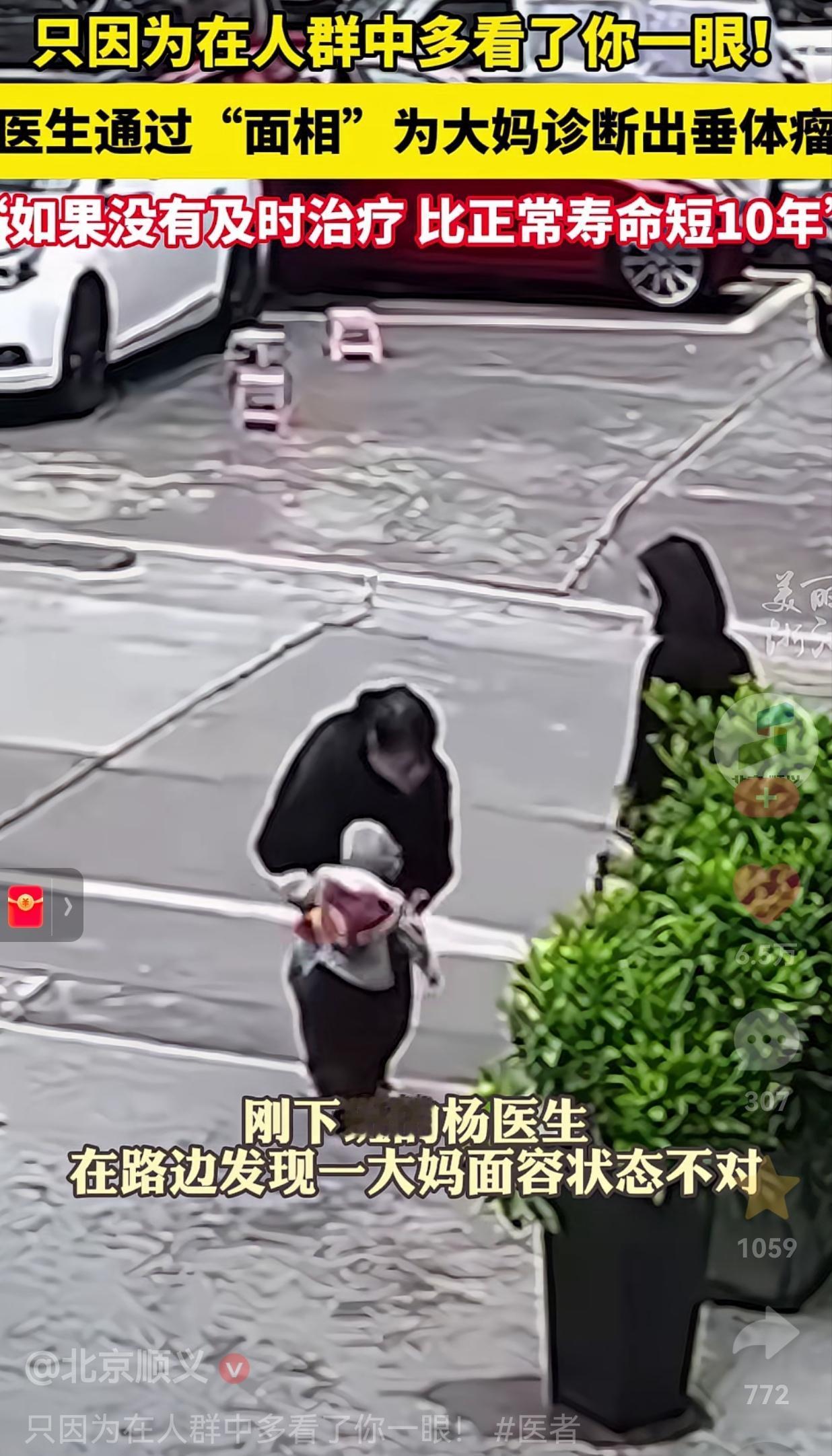 为人美心善的医生点赞!浙江金华,一女医生下班的途中,在路边看到一大妈面容状态不对,出于医生的职业素养,看到大妈可能生病了,不得不好言提醒。 女医生说:“你是不是有高血压?关节痛不痛?” 大妈也积极回应,大妈说:“嗯,确实有这毛病!” 女医生说:“你最好还是去医院查一下你的身体状况,这样也放心一点。” 大妈听从了女医生的建议,当天下午大妈就到医院就诊,果不其然,大妈真的生病了,被确诊为垂体瘤。 据大妈接受采访时表示,自己40岁以后,脚变大了,头也变粗了但是,自己不是专业人士,根本不知道这是一种疾病。之前自己穿37码的鞋子,而现在穿40码的鞋子。以前体重为106斤,然而现在变成了150斤。面部全部都变大了,跟以前相比,完全是两个人。 据这位女医生讲述,这种疾病,如果没有及时干预治疗,她的预期生存时间比正常人少10年。 后来,大妈接受了治疗,并给这位人美心善的女医生送来了锦旗,以表达感谢之情! 网友看到后评论说,大妈太幸运了,幸好遇到了这位女医生,如果不是她的提醒,她还以为自己什么事都没有呢? 还有的网友说,大妈和我朋友的面容很相似,我朋友就是垂体瘤,做了手术,从鼻孔里做的微创,现在肢体在变小。 很多时候,普通人对病情真的是一无所知。所以,平时只要身体不痛不痒,我们就会忽略,认为自己没有事情。 可是,我们哪里知道呢?有时候身体出现明显的异常,就算不痛不痒,也有可能患病了! 所以,为了自己的健康着想,定期体检必不可少,这样才能早发现,早治疗。因为,有些疾病真的不能拖,拖下去可能就把小病拖成了大病,真的得不偿失了! 对此,大家有什么看法呢?欢迎大家评论区讨论留言。