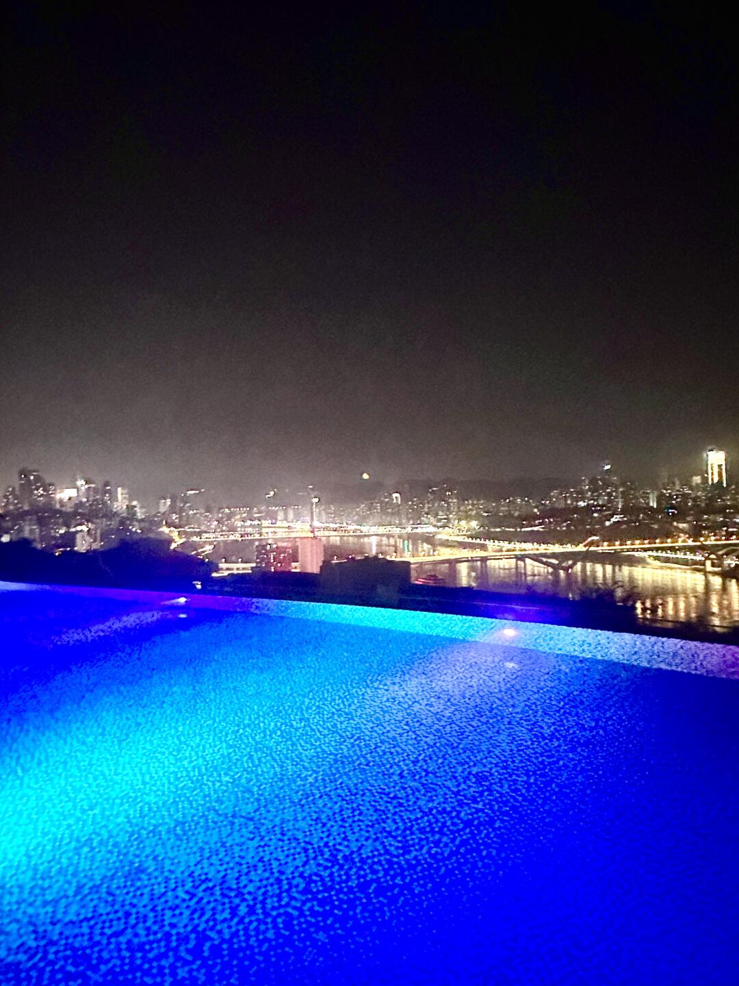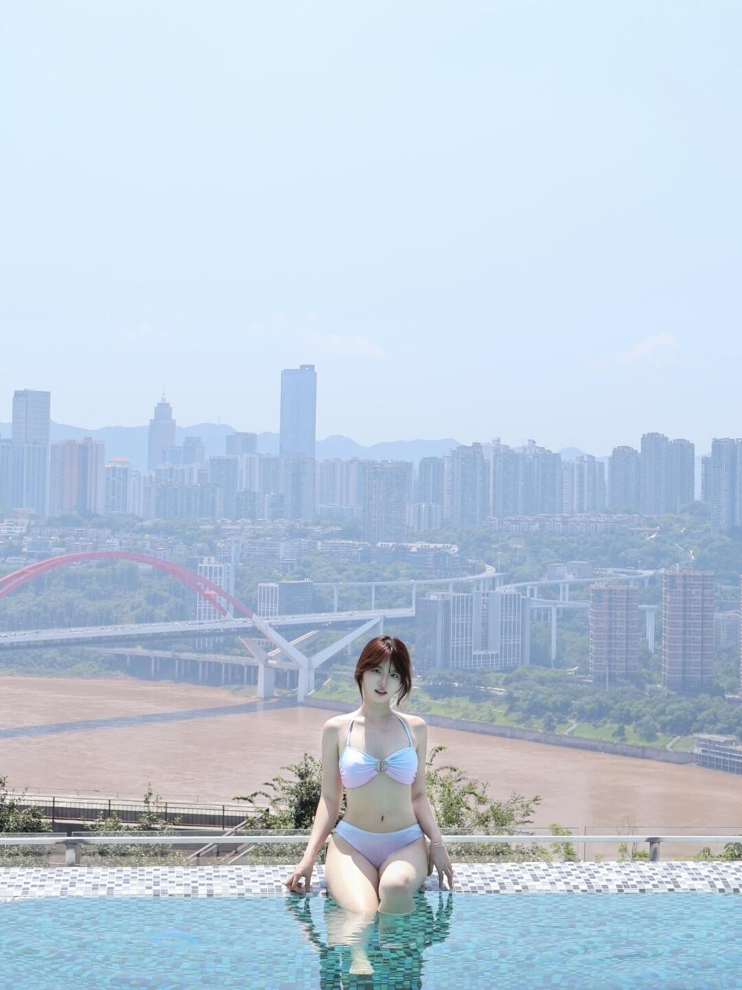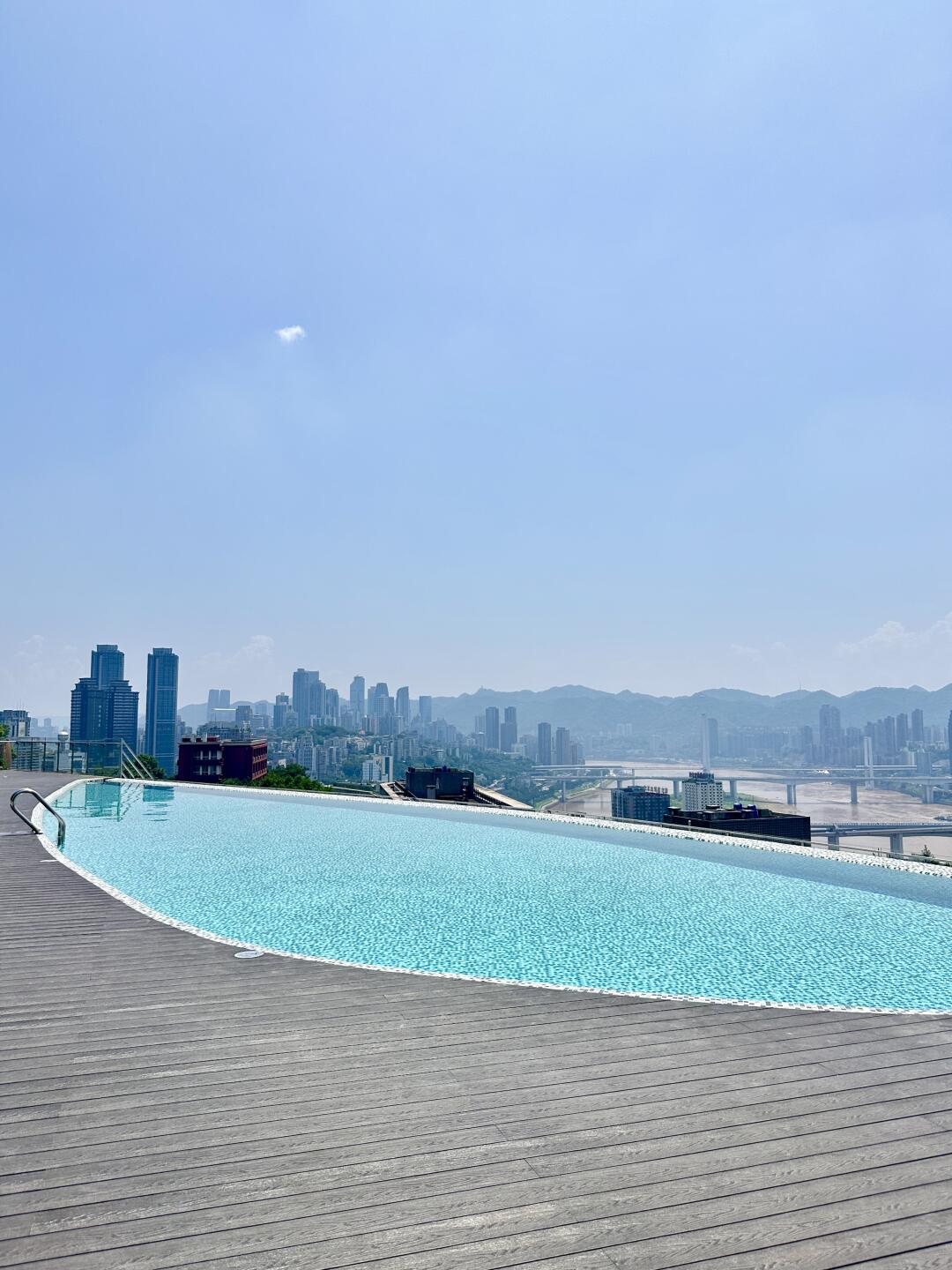 顶楼游泳池直接美得把我们魂勾走了!270°无遮挡山城夜景就在眼前铺开——嘉陵江的晚风、轻轨呼啸而过…无论是晚上还是白天都特别好看!!